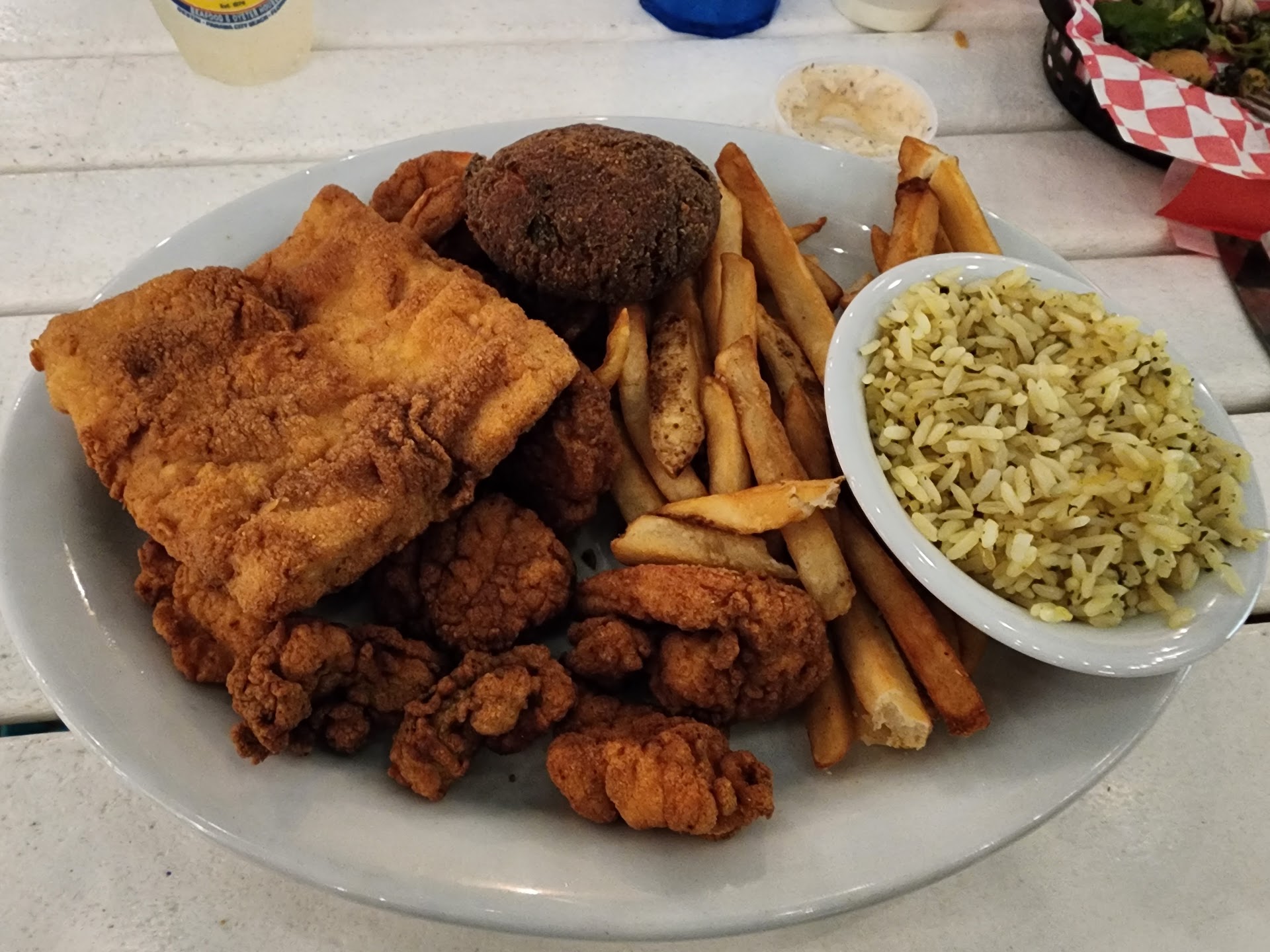I'm posting photos of the seafood platter, look at the color of the breading... it looks like the oil was indeed pretty old and tasted like it too. I didn't try the crab cake, it was so dark it was nearly burnt looking (its the dark brown lump at the top of the picture). The rice (side dish) was so dry that the rice was actually crunchy in some spots. I almost feel bad writing about how bad this was. A big waste of...