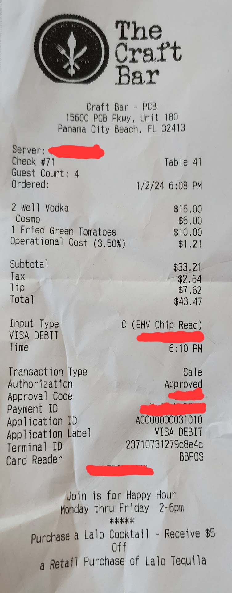 We were CLEARLY local and we asked about the happy hour specials and were obviously there because of happy hour. We had a server named heather, (I think she normally bartends) she takes our order a couple mins before 5pm (she claimed we ordered at 430 but our friends hadn’t even shown up yet at that point so we know that’s not true, she just said whatever to downplay it) after we all ordered happy hour drinks, happy hour appetizers, and happy hour entrees. It was so obvious we wanted to get the happy hour deal, I can’t stress that enough. She proceeds to sprint over to the computer and punch in our order 1-2 mins before 5pm (5 is when the happy hour starts) so she could charge us full price for the happy hour stuff. I made a comment about how we clearly were there for happy hour, it was obvious. Kinda seemed like a joke but no she legitimately was trying to get us to pay more and we did lol. And we all tipped 20% so she had no reason to right her wrong so she told us “whoops, I didn’t know y’all were here for happy hour”. So instead she assumed we are just dying to pay 50% more. After we told her we were there for the specials at the beginning. The way she handled it was like “deal with it”. Been going to craft bar since it opened. By far the lamest way I’ve been treated. Ended up paying double the bill I was expecting because we went for happy hour in the first place. I always leave 20% no matter what because I’m not a dirt bag and I reserve over 20%+ for exceptional service. I’ve been a server for 5 years so I get it but I never went out of my way to just screw customers and then when they bring it to my attention just blow it off. Not cool at all. If you are a sever just know if you act like you don’t want to help me how do you expect me to want to help you? Even though I still did and my friends...