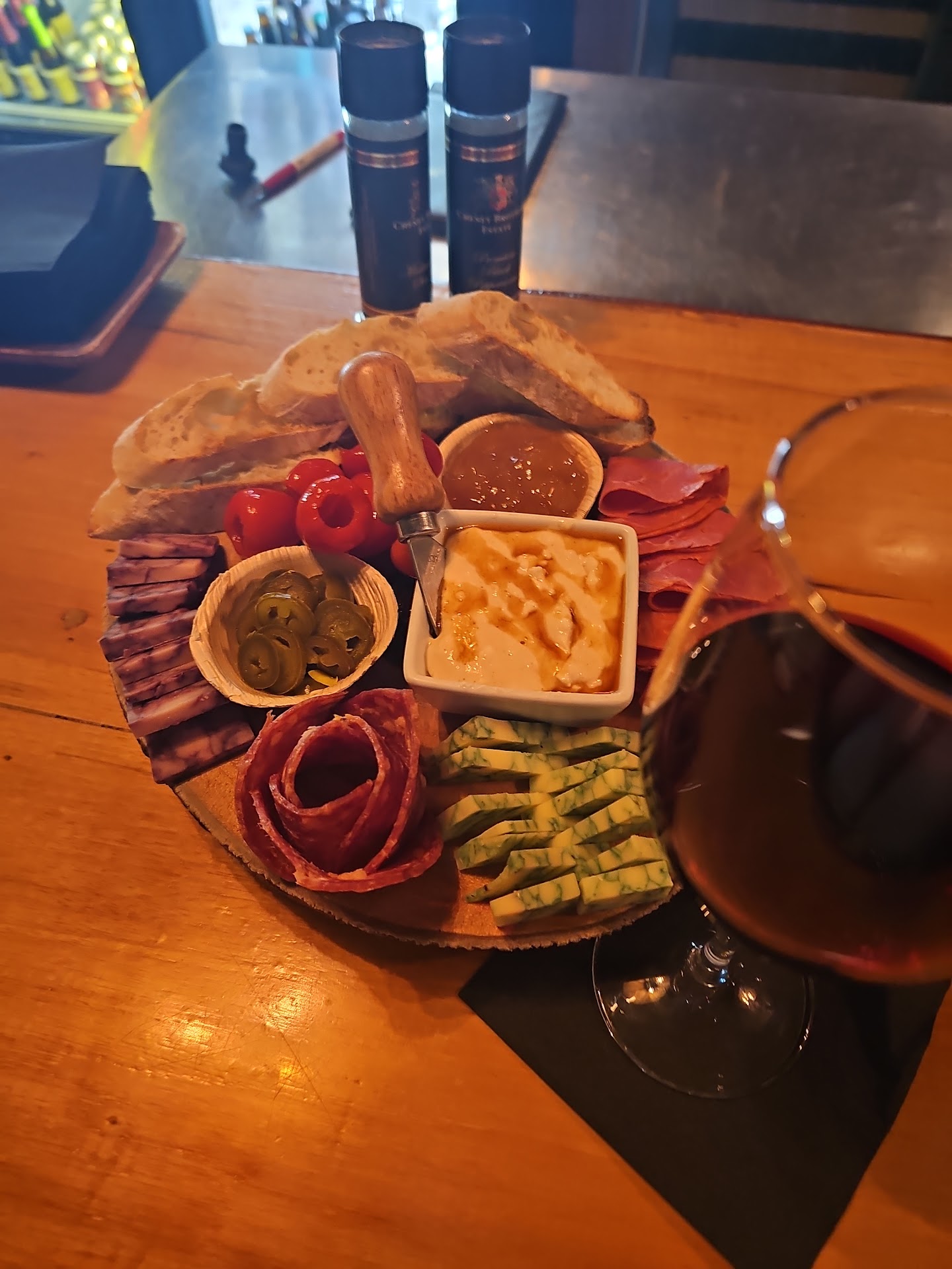 Read moreSo many things I love about Burgunbarrel! First, the atmosphere; Homey not pretentious. Couches and chairs up front, an upright piano, wooden wine crates covering the duct work. Sort of a speakeasy vibe. Second, the food; Amazing and diverse. The charcuterie boards are wonderful mixes of flavors, scents, and textures. Naan pizzas with flavors from traditional to unusual and simple to complex. Small plates to sandwiches, decadent desserts.Great to share in a group or to just stop in for a snack and pair with a worldwide selection of wines, craft beer, or seltzers. Most of the food menu offerings have ingenious, thoughtful names. My own favorites are The Greenzo, Pacino, Pesto chicken salad, Holy Smokes, and Baked Feta. Now third and last but by no means least Service. The icing on the cake. They treat everyone with the utmost respect. They guide the wine novice and introduce oenophiles to their eclectic offerings. For others, they have advanced knowledge of wide selection of craft beer, seltzers, and ciders. The staff is friendly and welcoming. David, Chris, and Joe have always made me...
