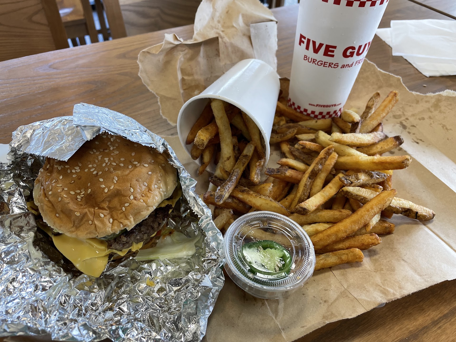 Read moreThe man that took my order was very polite and accurate with our order. All of the employees smiled and were friendly. The wait was fair. Our burgers were delicious, but I cannot give 5 stars because of how bad the fries were. Unfortunately I didnt realize how poorly cooked the fries were until I had gotten back on the main road and had a crying toddler in the car, so I couldn't make this trip back to the store. Our fries were cooked incorrectly. They were limp, greasy, soggy and over-browned. I've eaten at 5 guys many times and the fries are my favorite so this was a big disappointment :-( . I've never been to this 5 guys location before, so I'm unsure if this was a mistake made by a newer employee or if this is an often occurence from lack of training. Check your fries...