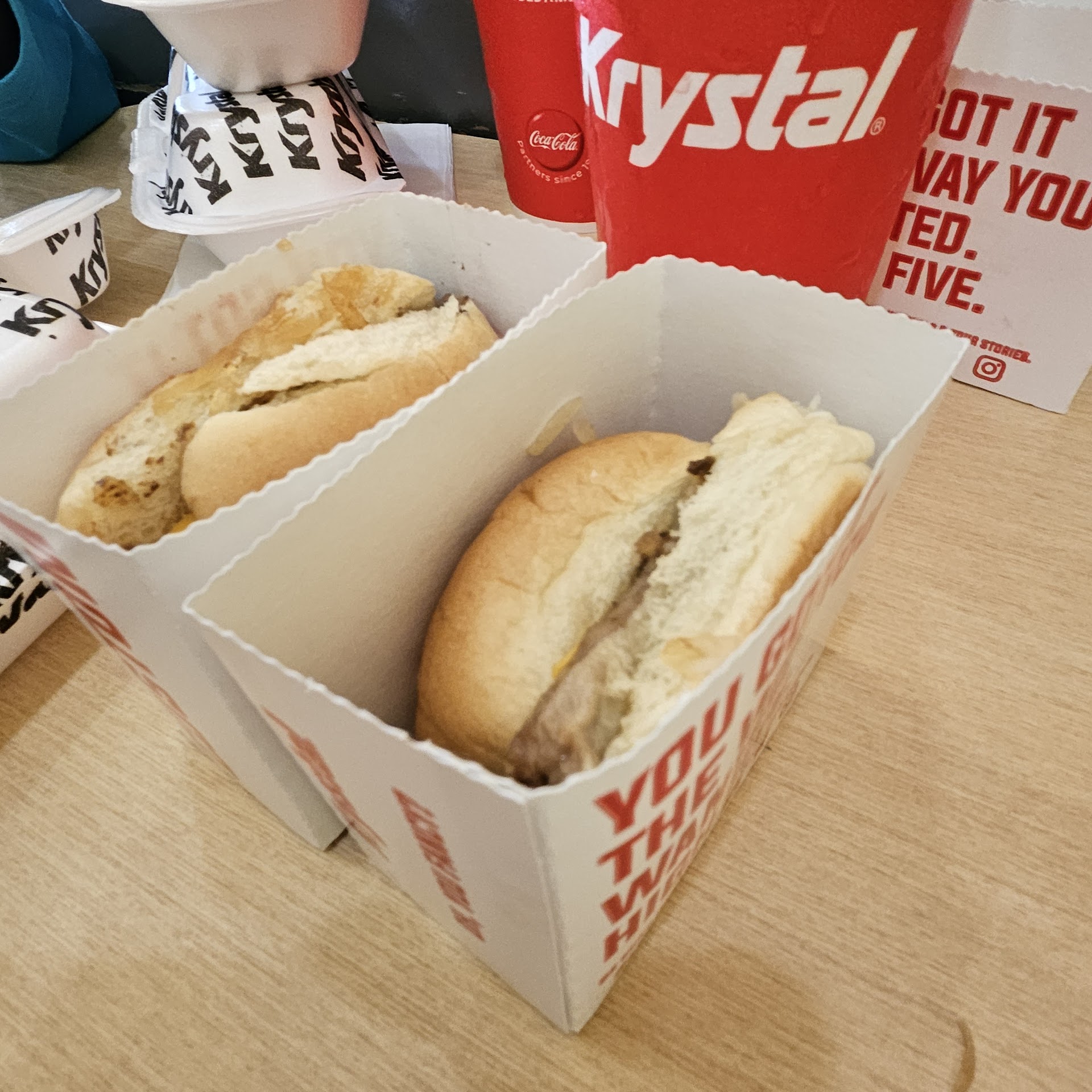 Read moreThe wife and I went in for lunch the other day. It was typical Krystal burgers. I will say they don't seem to taste as good as they used to but maybe that's because I haven't gone there in a long time and I usually don't eat them except once in a Blue Moon.. My wife really loves them . It was her 1st visit to this place she had never had these burgers.. What was most aggravating is is when we got to the window the lady give us our food but didn't give us our drinks so so we waited there for a couple minutes. She then came to the window and asked if everything was OK I guess because we've been sitting there for a little while after she gives us our food. I told her we were still waiting on our drinks and she said oh sorry about that and asked what our drinks were. She said that was 2 sprites right? I answered her no it was 2 Dr Pepper's. She said OK1 second and handed us a couple of drinks about 30 seconds later translator and it was 2 sprites not too Dr Pepper's like I had reiterated to her . The only thing I can think of is maybe because they were understaffed Be that as it may it was not...