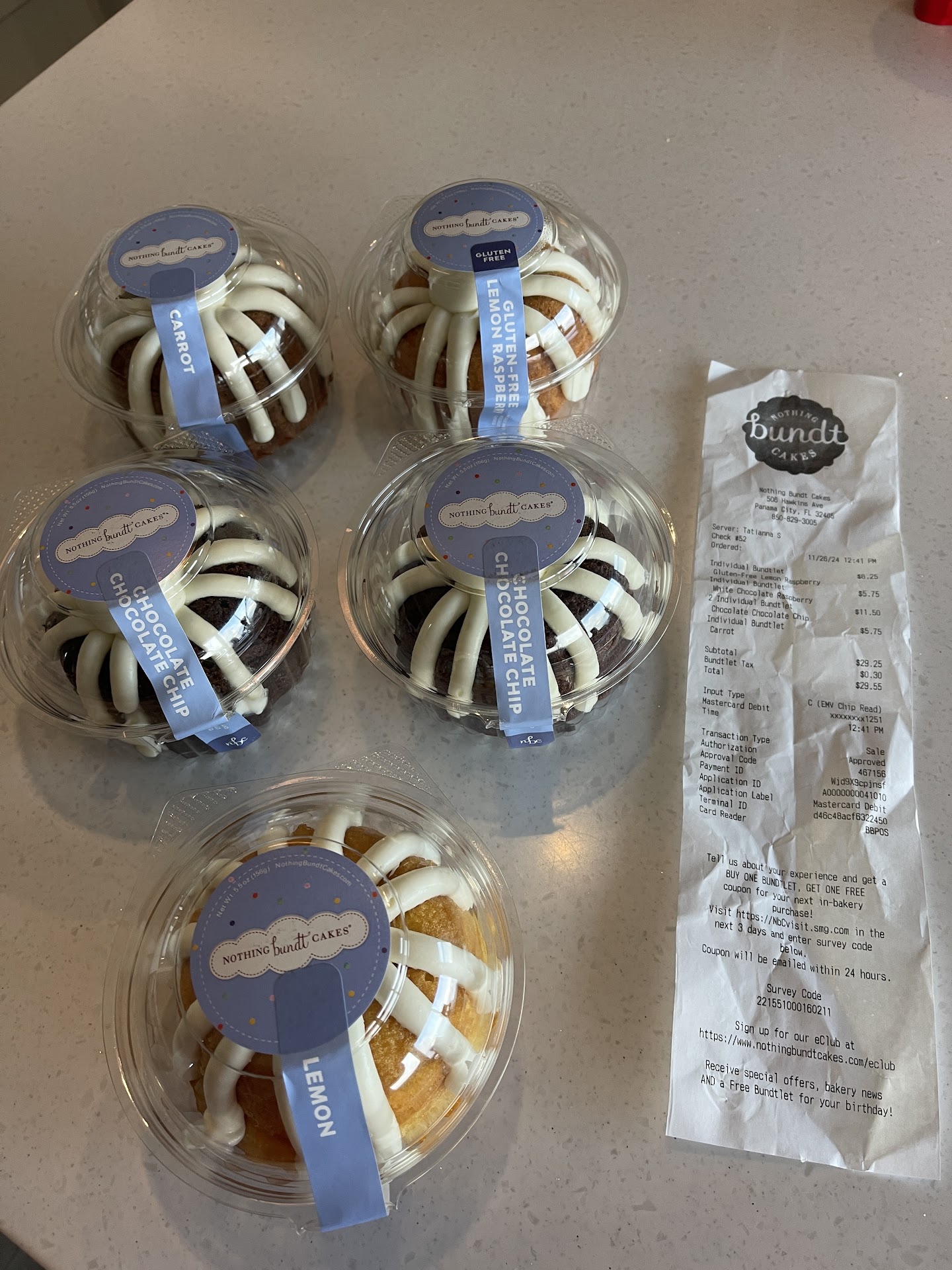 I purchased 5 Bundtlets 1 Carrot, 2 Chocolate Chocolate Chip, 1 Gluten-Free Lemon Raspberry and 1 White Chocolate Raspberry. I got home and took the cakes out of the bag I had 5 cakes but instead of the White Chocolate Raspberry there was a Lemon. So I called the store because I did not want the Lemon flavor and l explained the situation to them and they said to bring back the lemon Bundlet and they would exchange. Thatâs perfect however I was 15 miles away and could not come back today so she put me on hold then came back and asked if I could come tomorrow. I said yes then the person asked well what time would I be in the store, I said I didnât know. The person insisted I give them a time so they could let whoever was working the situation. I asked well couldnât you just take my name down with an explanation they said no. They were insisting that I had to give them a specific time of day when I would be there to do the exchange. I told the person on the phone forget it thanks but no thanks that I could not give them a specific time because I was not sure what time I could get back to the area (remind you Iâm 15 miles away). Why they could not just take my name along with the date I would be in the store to do the exchange is beyond me. Needless to say I will not be back to Nothing Bundt Cakes in Panama City, Florida again. They need to learn and have some better customer service not even an apology for messing...