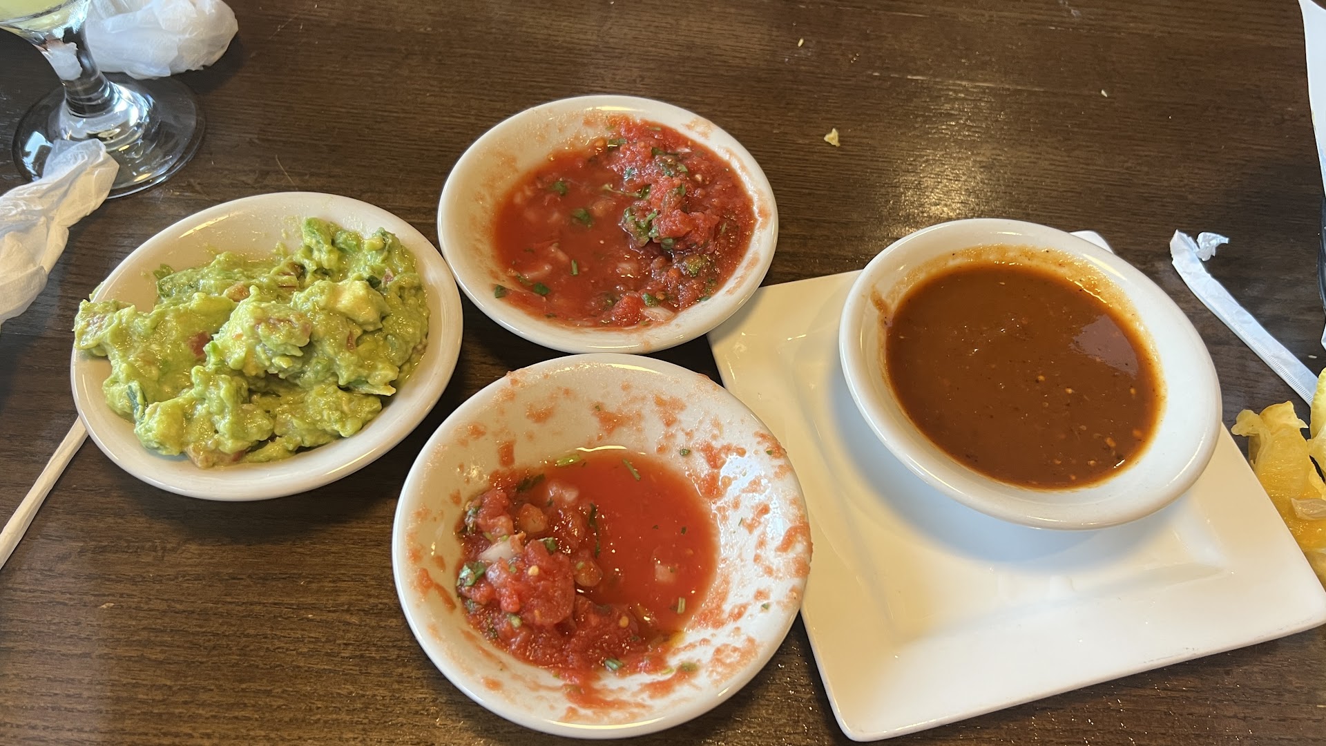 Overcrowded table: The table was cluttered with chips and salsa, leaving no space for meal items, leading to a messy and uncomfortable dining experience.