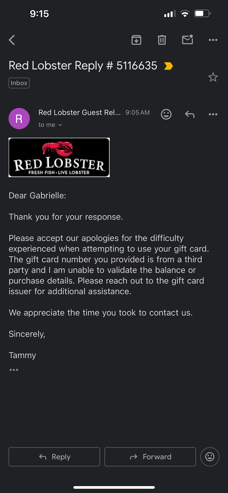 Yesterday was my 37th birthday, so for dinner my husband brought me knowing that It’s crab fest. We walked in at 8-815 and the restaurant is dead all except 4 guests at the bar. It took 5 mins of standing at the host stand facing the bar before anyone even acknowledged us standing there. Finally seated we got a server named Gabby which excited me because we share the same name. Her energy was high when it comes to conversation but she couldn’t remember a thing.. I have issues with my blood sugar so I immediately asked for water, she kept forgetting to bring water to the table and kept laughing.. Then when it was time to pay, I wanted to use one of gift cards we’d received as a wedding present with $100 balance on it. I told her to run the gift card exactly $100 and the rest on this debit card but she didn’t she ran it for more than the gift card amount so of course it declined.. I pulled up the balance/transactions and showed her and the night manager where she was the reason for the hold on the card, she’d done whatever she wanted with my card.. as I was speaking to her about it she yelled and walked away.. I serve tables in pier park, I do her job, the restaurant was empty, there is no excuse for bad service especially in an empty restaurant.. all she had to do listen.. my husband was polite and handed her his debit card but me myself, I feel they could’ve dealt with this in a better way.. and as I’ve read the reviews I can see I’m not the only customer she got hostile.. I’ll be calling the corporate office soon as they open today. I will be perusing legal action against red lobster and their server Gabrielle.. corporate are a bunch of bullies and any lawyer would love the opportunity at a knock out of the park case, especially when I have the all the necessary documentation. I guess yall would rather pay me at least 100 times over in legal fees and restitution then to just refund my money. Either on my bank card or my gift card since you have my money from both but a refund to my debit card...
