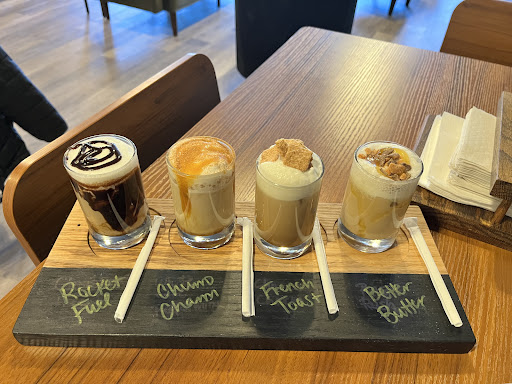 I highly recommend the cinnamon rolls but don't recommend the latte flight. the cinnamon roll does get warmed up and has so much melty cream cheese. As for the lattes; Disregard the lack of Expresso. They simply just didn't have much flavor. Didn't taste anything but milk with the French Toast, S'mores just tasted like chocolate milk, I had to double check I picked up the caramel one because it also tasted like milk, and the raspberry one was the only one that tasted different but still just a hint of raspberry flavor.