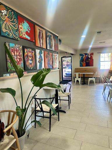 It has a wonderful and inviting aesthetic with artwork from various artists covering some of the walls, plants, tons of different options for seating, a case for bottled drinks and another for pastries. It even has a drive thru, which I would've never known had I not decided to stop in.