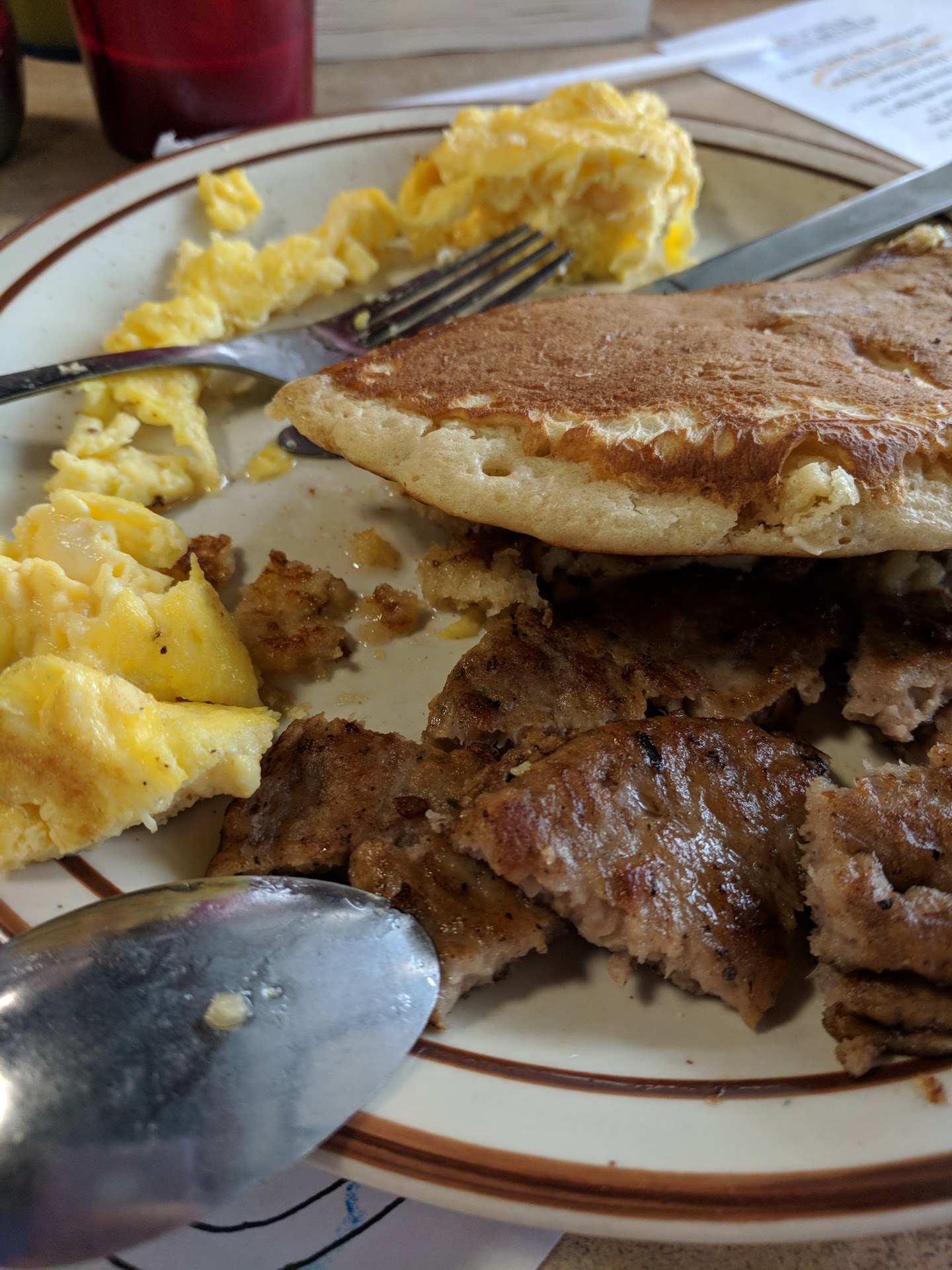 We've been driving by this place for years, but when it was time to think of a breakfast place to try, it just never came up. This morning I happened to remember it, so we decided to give it a try. We arrived just after it opened at 7 am, there were only a few tables in use. We were seated quickly, and the server asked what drinks we wanted as well as leaving us menus and tableware. Three minutes later she was back with our coffee and took our order. I ordered the Chuck & Eggs; a 1/2 lb of ground chuck, two eggs, hash browns and a choice of toast or "dollar pancakes" - I went with the dollar pancakes. I had the chuck cooked medium and eggs sunny side up. My girlfriend went with The Hungry; three eggs (scrambled), three bacon, three sausage links, hash browns and she also went with the pancakes. My breakfast was excellent. The ground chuck patty was generous in size, and had a good crust of combined grilled meat as well as spices. Lots of crushed black pepper, salt, I think some cumin, maybe cayenne and garlic powder. Just a touch of pink to it. The hash browns were crispy and brown, the eggs yolks were not set, the whites had just set and there was some sizzled lace on the edges. The pancakes were good, they had small individual serving carafes for the syrup. My girlfriends breakfast was good. Her scrambled eggs were very good, everything was cooked without being dried out. She thought that the bacon was excellent, thick cut, and well done, almost crispy. Pancakes were good as well. The only thing bringing her breakfast down were the sausage links. She thought these were rather bland and kind of mealy in texture. She only ate one of the links that they brought. I definitely plan to try this place another time in the relatively near future. Next time around, we might give the sausage patties a try, see if they're better than the links. I also want to try their home-made corned beef hash. If the ground chuck's spicing was any indication, this could be a winner as well. Our coffee was okay, nothing special, but the server kept on coming by to check and see if we wanted refills, which is always a good sign. Unfortunately, I didn't think to take photos before we started in on breakfast....