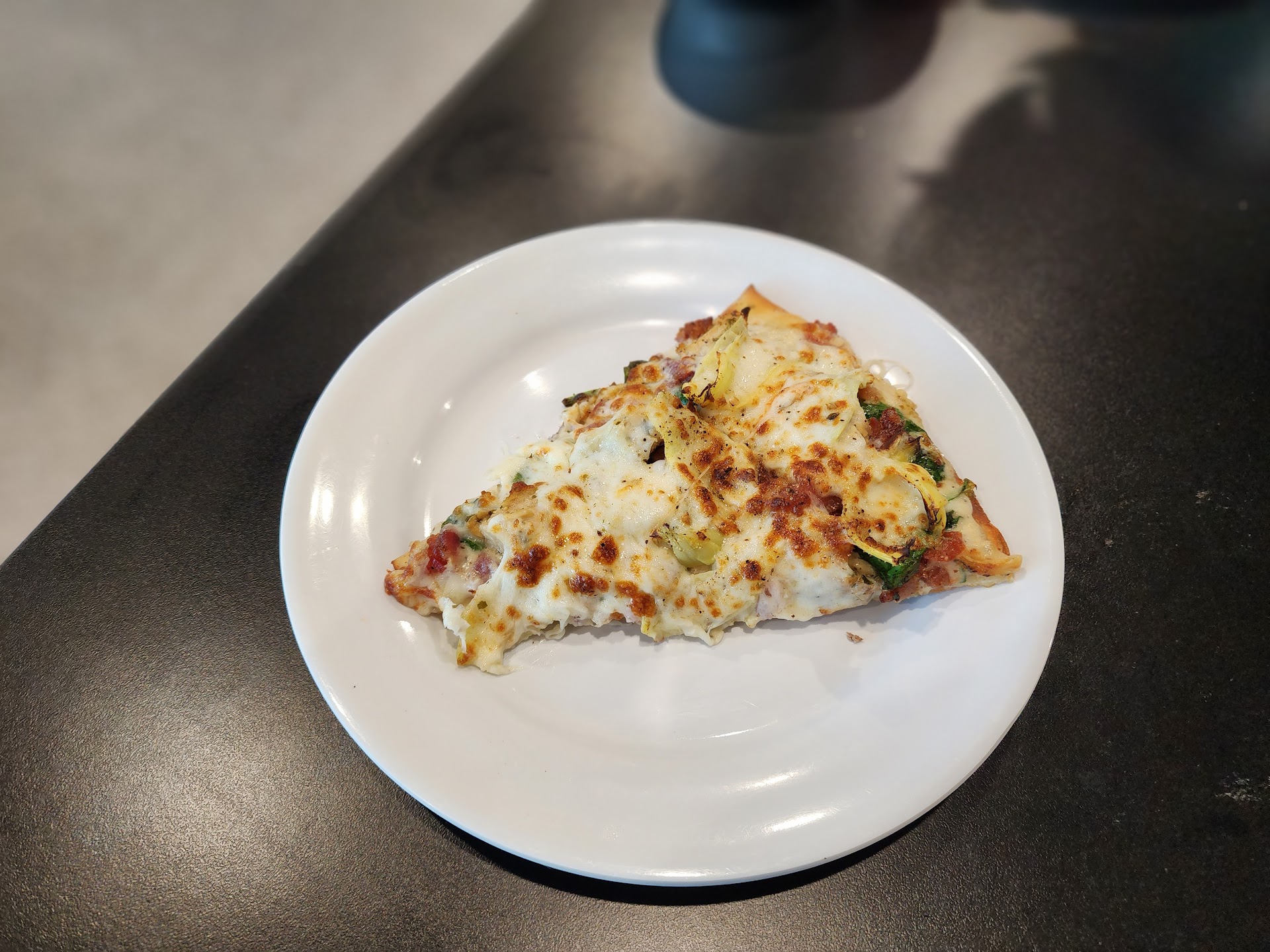 They went over the menu with us and gave us tips and tricks from other customers and ultimately we settled on slice orders of The Alfredo, Tony's Favorite, The Veggie, Spicy BBQ Chicken, Pasta Salad, and Two pieces of Cheesy Bread.