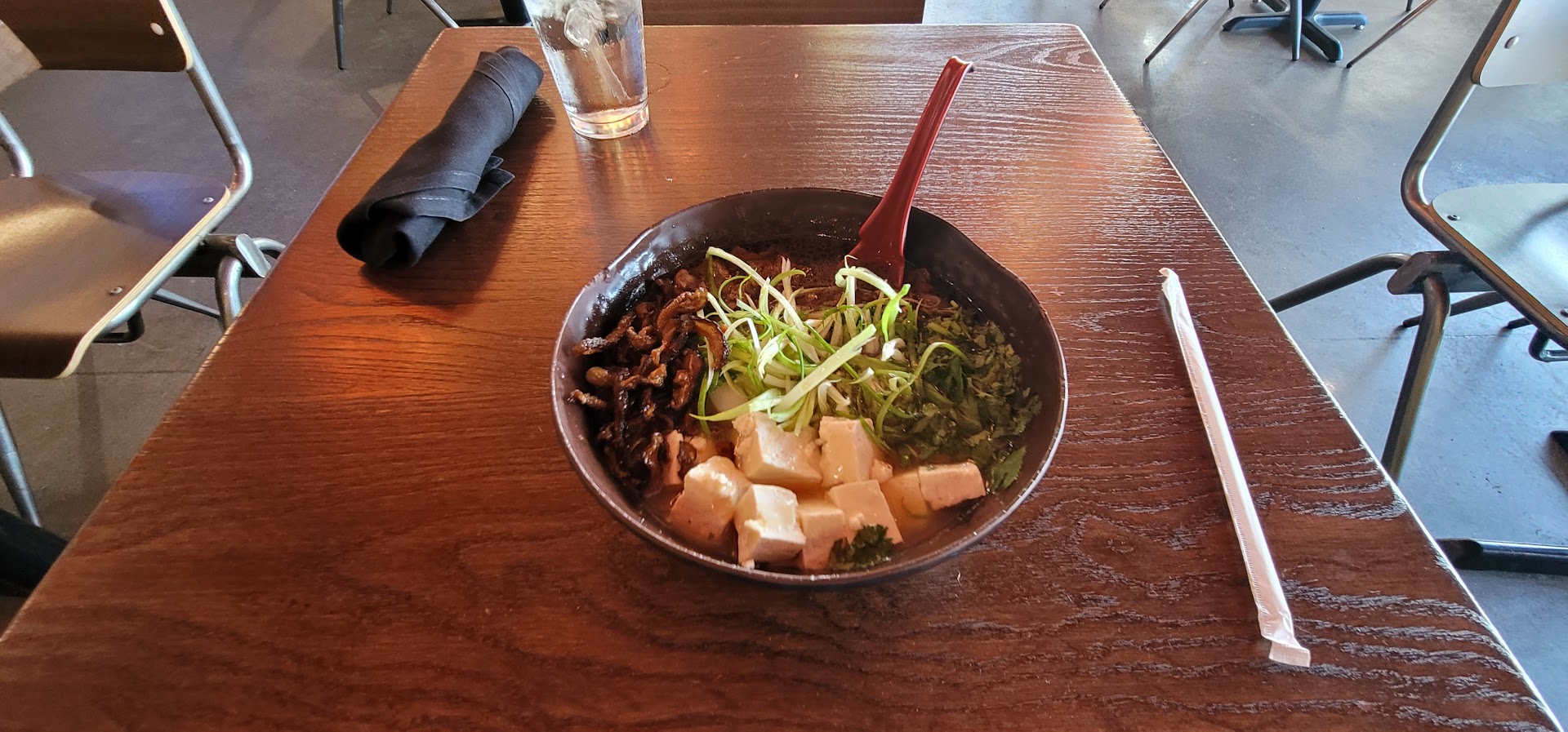 The ramen broth tasted more like water than broth, and the meat was actually unpleasant to eat, taste and texture wise. Compared to a bowl of traditional Japanese udon or ramen, it was a big miss. Not to mention that adding extra toppings (mushrooms) came at a premium while adding very little to the dish (really small pieces and not many of them).