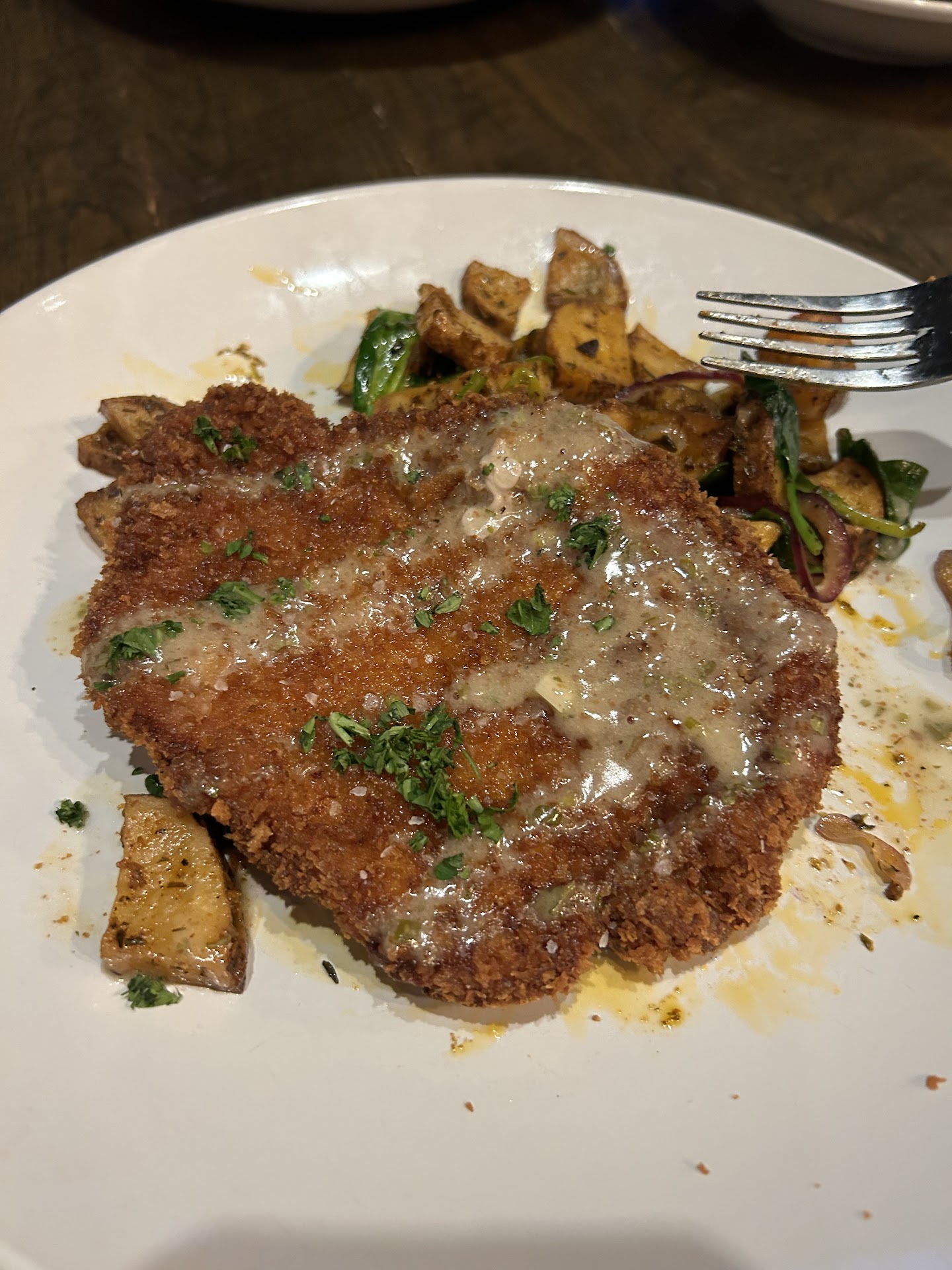 Read moreThis will be one of those polarizing options that appeals to many folks but alienates others. My wife and I shared bites from two entrees: the fried chicken breast sandwich and the fish with brussells sprouts over risotto. Paired with soda (sorry!).