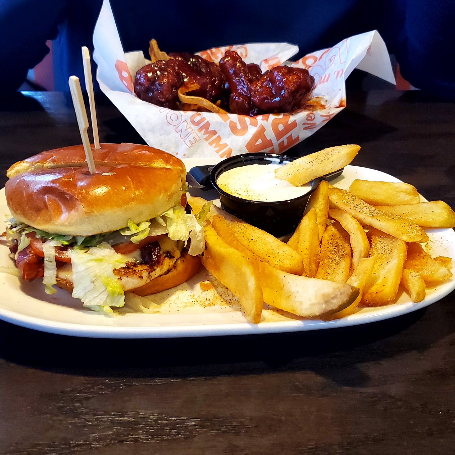 The California chicken sandwich was cold along with the fries. There was also burnt bacon on the California Chicken. We immediately asked for hot fries, the waitress did bring hot fries right out. The wings were tasty, but not as warm as they should have been.