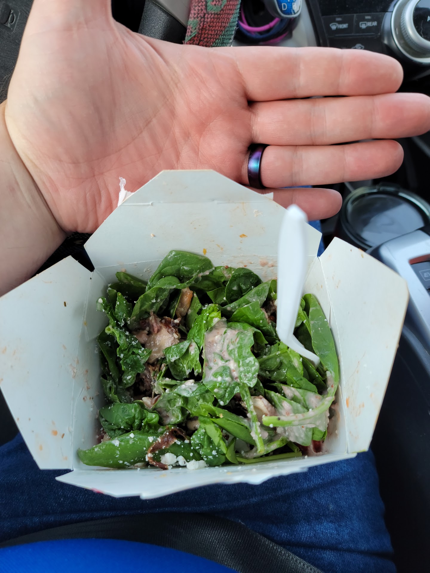 I checked the box to include cutlery with my order but when I arrived it was not in the bag. I stood at the bar for a couple minutes waiting to be recognized, but I eventually had to interrupt someone behind the counter to ask for cutlery. After I got on the road and started eating, I realized there was no chicken added to my salad. The size of the salad was extremely disappointing, as you can see below compared to the size of my hand. Was closer to 1/4 or 1/3 salad than 1/2.
