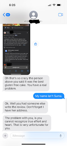 When I politely reached out to share feedback and ask for a partial refund, Rebecca became defensive, dismissive, and ultimately unprofessional. She told me she only made a $10 profit off of a $120 cake, minimized my concerns, refused any resolution, and escalated the conversation by harassing me via text and making rude and threatening remarks directed at both me and my aunt.