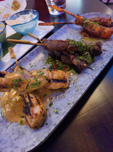 I love the concept here. The Host is dressed like a flight attendant. The skewers were flavorful and delicious. My favorite was the chicken. It was tender and I love the peanut sauce, the beef was also good with chimichuri but it wasn't as tender. Least favorite was the shrimp. The pita dips were all delicious especially the babaganoush. Only sad thing was the burnt pita.