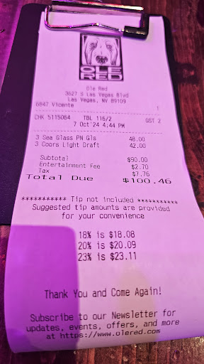 Read moreI donât ever leave reviews but this ole red stood out from the rest. Iâve been to almost all the ole reds, Iâm from Nashville and I came to town for PBR week a little early. I came to ole red Las Vegas 2 days in a row with my wife we love live music and especially country. Bands were great and late night on the roof the DJ rocked it. The food was ok, we tried the nachos, wings and chicken sandwich. Doesnât compare to Nashville food to be honest. The worst part of the visit were the bartenders. We somehow had the same bartenders both nights. 10/16 Thursday was the first night and we wanted to sit on the first floor and enjoy the band, we sat at the bar on the end and tired to start up a conversation with the big muscle man but he seemed like he was in a bad mood. He was angry when we asked questions about the beer. When I asked if they had a blonde he just pointed to the draft beers and said âthese are all the beers we haveâ and walked away. He came back and just kinda stared at us until we told him our order. There were seats that came open in the middle of the bar so we moved to be able to see the band and sit side by side. We got served by the other girl when we moved and she didnât even speak she just said what you want. I guess southern hospitality doesnât run throughout all the ole reds. Service for the rest of the night was blah, they didnât come to make sure our food was correct, it took forever to get refills on our beers. We didnât stay long after we were done eating. The second night 10/17 Friday we came back and ate dinner on the second floor this time with a server she was great but I donât remember her name. We decided to check out the roof top and to our surprise the same bartenders were on the roof that night. The big man was so angry again I even tired to compliment him cuz you could tell he worked out a lot but he didnât seem to like that and walked away from us, he didnât attempt to serve us again after that. The girl was rude and we felt like she didnât want to be up there we ordered a round from her and she tossed us our money back after we paid. There was a new bartender named Jack.. he was the best bartender we met. Nice, helpful, talkative, made our drinks in time, he didnât care that we asked questions about the drinks either. If I had to recommend this place I wouldnât because of those 2 bartenders⌠they made our time there so miserable but bc of Jack I would recommend our other friends coming for pbr to visit. I might be back again this weekend and I really hope I donât see those other 2...