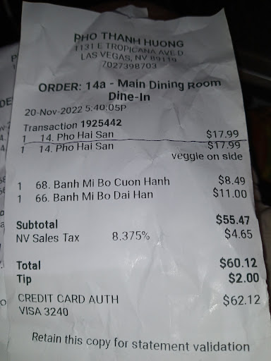 I would have straight up given this spot 5 stars if the price of their pho was in the realm of reality. Luckily, I have another pho place and I was here fo the Banh Mi, which was excellent. Since I mentioned the pho, I'll start with it and then get on to the stuff I'll be back for. It was actually not bad at all. Probably better than average for the city but I'm from Seattle and have been eating this stuff for 20 years, When I left in 2019, I could get a half gallon of Pho Thai for $6.75. I took that all for granted because it took me over 5 years to find consistently good pho in LV and the prices are all closer to $15 for a smaller bowl than I used to pay $6.75 for. I understand that the economy is different now but my sister in law was complaining 16 years ago that it was closer to $12 in London where she was attending school & that was crazy high. To pay nearly $19 for a bowl half the size of my favorite spot back in Seattle isn't going to work for me. Additionally, in my 20+ years of pho consumption, this was the first place that put the sprouts and basil in the bowl for me rather than allowing me to adjust my flavor to my liking. Please take this as constructive feedback. The most costly part of producing pho is the time it takes. The amount of meat and noodles in mine was fair but it is still mostly broth made from boiling stuff in water.