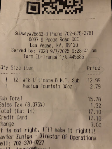 Very upset. Very disappointed, and concerned. I’m looking at my receipt for the “served by : 7928 “ sandwich maker, for Subway in Las Vegas on Pecos and Patrick Rd. who I kindly told them how I’d like my sandwich made. I walked in at 9:00pm looked her and smiled, nothing more than just showing respect. She works there and didn’t even smile back! I guess her phone texting was more important because then she told me to hold on for 7 seconds. But that’s normal, not being attentive to customers and being on your phone at your job site is normal in todays world? Fianlly after she asked what I wanted and so I told her the B.M.T. Please and when she asked on the “Ultimate B.M.T. “ for toppings. I actually had to verbally ask her to add more lettuce on the sandwich bread because if she didn’t then I basically would just be eating the bread scattered with a just few pieces of chopped leafs of lettuce 🥬 very sad, and unfortunate that we live in a world where people don’t have your best interest, a generous heart towards a customer or see you in a way where they see themselves being unwilling to want to carry out a genuine , meaningful and decent experience in an effort to make whatever you do matter and leave a positive impression on people. That’s not it, she literally gave me 5, 5 tiny little pieces of chopped black olives 🫒 when I asked her if I could please get a little more than that she told me “no that would be breaking the rules”. EVEN WHEN I STATED THAT I WOULD PAY EXTRA FOR EXTRA BLACK OLIVES. something is very wrong with the people in this Country. This person should be re-trailed on how to actually make a proper sandwich if not fired. Her gangster “rap” music in the back of the store wasn’t appealing much so either, since it was interfering with the stores general public’s enjoyment , easy listening music. I should of walked out when she said that she couldn’t add more toppings because what’s a $17.10 foot long supposed to look like to you? Let me ask you this, when you go to your favorite restaurant and tell them how you want it exactly how you describe, do you imagine in your mind - skimpy and without decency or was that just how I was treated. I will be calling corporate in due time to find how who this person is to...