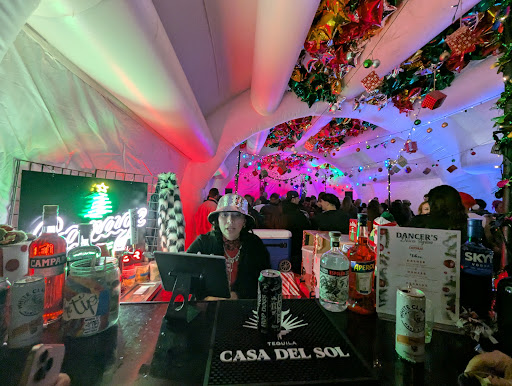 The igloo is up since October but the actual event is all of December with DJs, bands and such indoors. For the event we attended on Saturday, red solo cups are given from indoor bar. Or speciality cocktails are made indoors too in special cups. The two bars outdoor serve different drinks in clear cups, and may differ in offering beer or seltzer. Apparently, an outdoor band is not a usual occasion so it was super crowded for Mega Scopes.