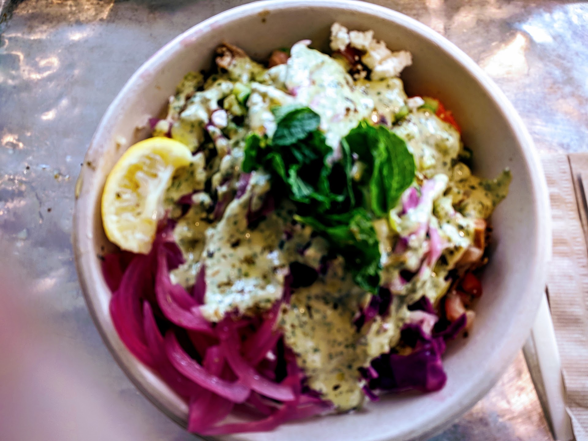 Pros: Lots of food choices, and lots of included extras Food is fresh and very flavorful Cava sources it's produce and meats from local and regional farms All hummus and sauces are made in-house Lots of beverage choices, including Maine Root soda, made with cane sugar instead of high fructose corn syrup Plenty of seating both in and outside, and clean bathrooms