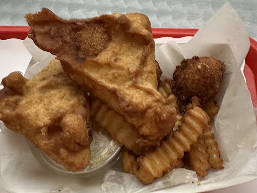 As for the food.. note my picture where the chips are essentially 8 fries. The crust on the fish is pretty soggy. Little to no crunch. I can taste slight uncooked batter. The hush puppy was crispy but the interior was also under cooked.