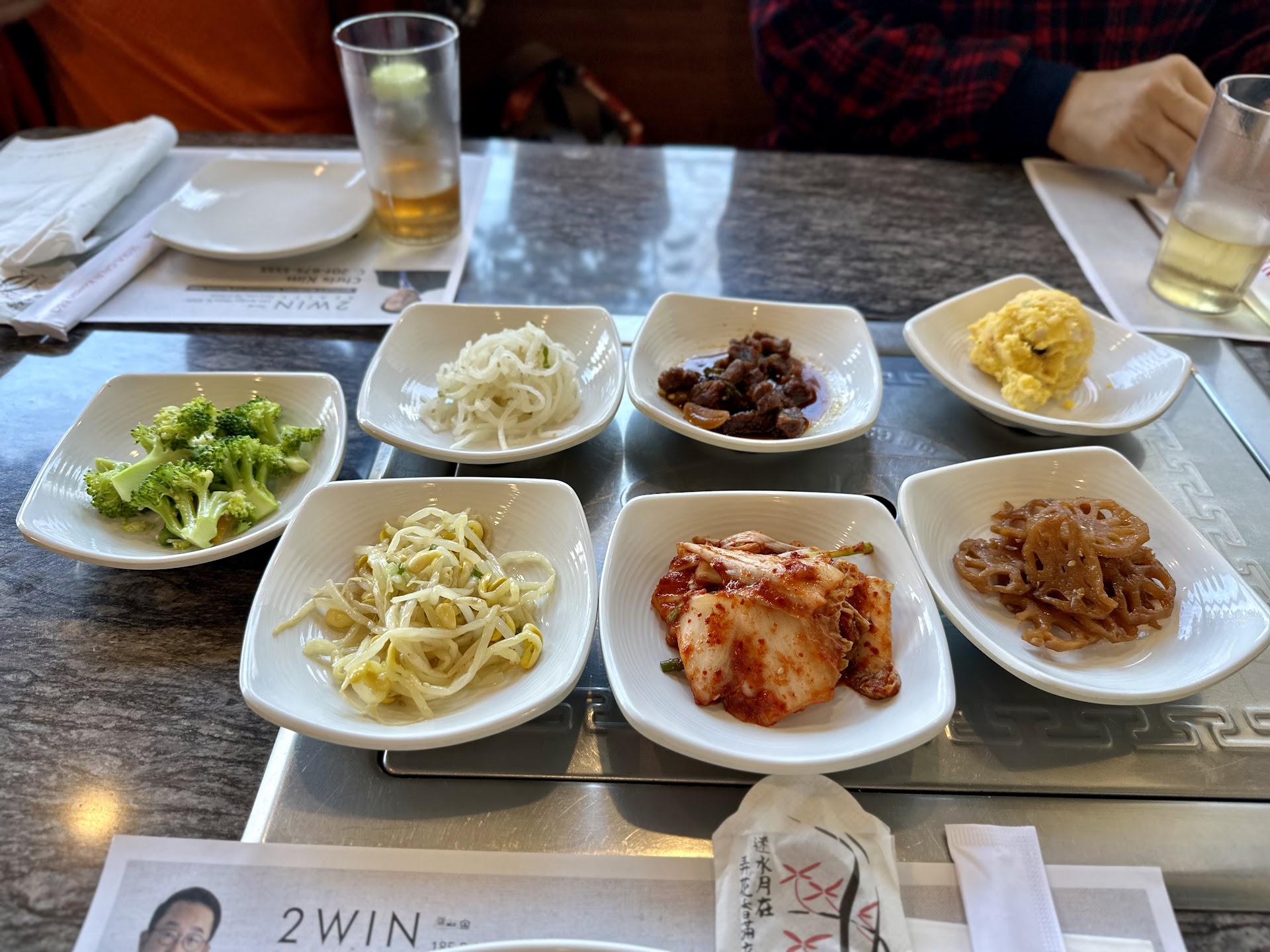 As soon as you sit down, the default beverage offered is warm barley tea (which is much appreciated during those colder winter visits). The banchan, or side dishes, are few but a little more robust here than other Korean restaurants. During my last visit, we were given plates of standard kimchi, sprouts, and seasoned broccoli. I was also surprised to find pumpkin-egg salad, soy marinated lotus root, and soy-marinated ribeye pieces. The offerings change a little from visit to visit, but they're always decent to downright delicious.