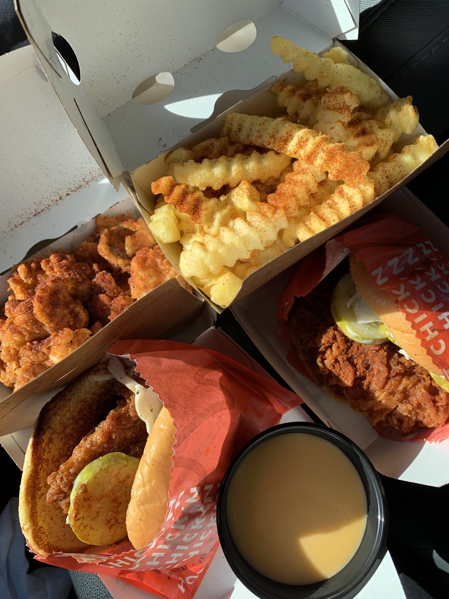 We wanted to try the spicy chicken. I ordered it hot and my husband ordered it fire (there's hot, extra hot, and fire). We couldn't tell which one was which because there wasn't any sort of labeling, and they both looked the same. It's basically just a regular chick'n shack and the "spice level' is the amount of cayenne pepper they sprinkle on it. I ate half of the fire one before I realized it wasn't mine but there wasn't a huge difference between that and the hot one. The chicken was also overfried, so it was dry. There’s also no option to customize it so you can’t add or remove anything even if you wanted to. Cheese would have helped the sandwich go down a bit easier.