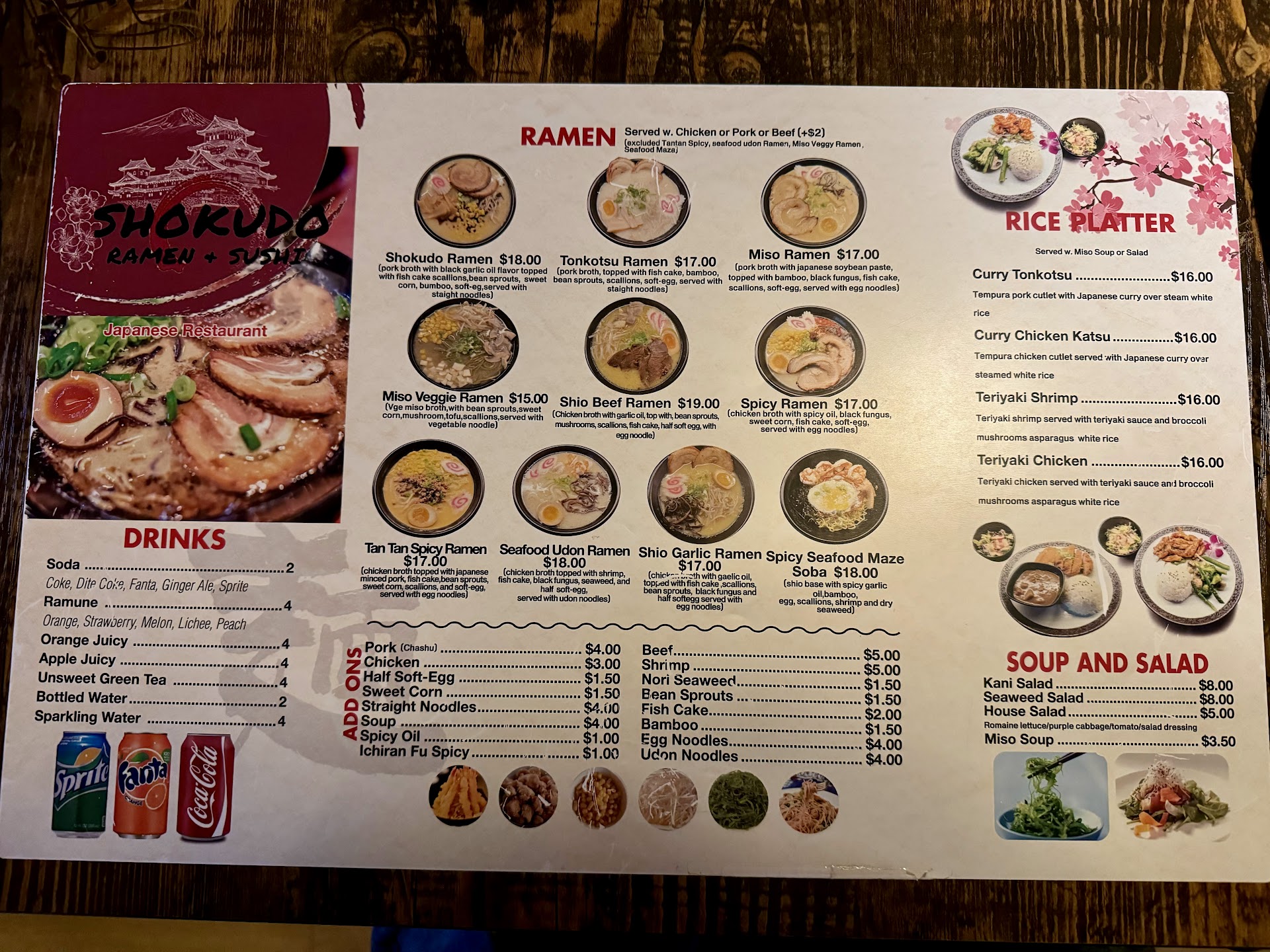 Let me elaborate (I’m Korean and love & respect all 3 cultures)- Japanese food requires high quality ingredient and precision. It’s reflected in every aspect of their lives. If you’re gonna do ramen you need to really learn ramen. (That goes for every cuisine yes, but Japanese has higher bar than most) I get that majority of Americans in the suburbs aren’t New Yorkers and aren’t as discerning, but on our recent stopby we were sorely disappointed with just lack of attention to detail and truly awful ramen. Atmosphere (2/5) - Where are we… 90s hibachi joint en route to Niagara Falls? Why so dingy and dark? What’s with the over the top, chintzy decor? Japanese = minimalism. Less is more. It was very an awkward vibe (tiger mural anyone?) that tried to be something w/o thinking through. Service (3/5) - Server immediately forgot to bring a hot oil when I asked despite the restaurant being only 30% full on a late Saturday afternoon. When we expressed utter disapproval of an ingredient, she did nothing to make our experience better either. Ramen also took more than 15 min to come out on a slow late Saturday afternoon only 25% full. Food (2/5) - like I said I was already bracing for the worst, so I figured I order their namesake ramen. Shokudo Ramen (3/5) wasn’t terrible per se. It had flavorful broth and noodle was cooked well. The problem was in utter lack of topping - there were literally two pitifully thin (1/8”) slices of pork that were decent but 30% fat. Two pieces of sad pork in a $16(?) ramen bearing the name of your Ramen restaurant…? Are you kidding me?! But unfortunately it gets worse- wife ordered the Beef Ramen (1/5). It literally had a Chinese-style braised beef that must’ve been from a cow hoof… it was thick and tough with barely any taste. And the broth had that metallic fake broth taste (bullions) that simultaneously was somehow really watery and flavorless… so much so that we put the said hot oil to barely salvage it… to not waste food. My wife barely had 1 piece of rubber and gave the other one piece to me and I couldn’t finish it. I should also mention that kind of beef flavor works in Taiwanese beef noodle soup, not Japanese ramen. We desperately wished that we had gone with my first instinct of going to Shake Shack a door down but you know, wife said soup.