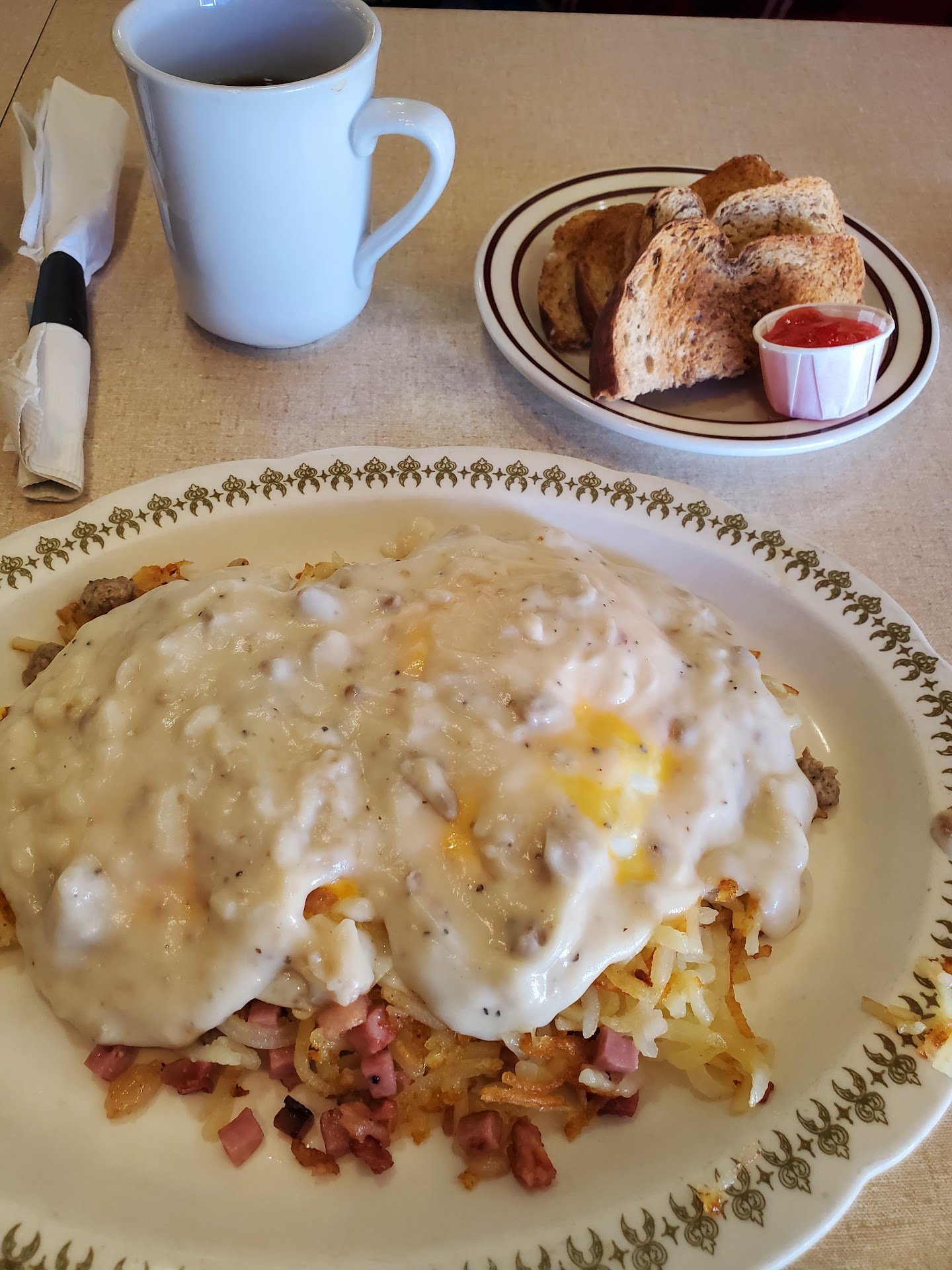 The most disgusting dining experience I have ever had. We ordered a big country skillet, the only thing cooked thoroughly was the precooked ham bits. We ordered two pieces of the raisin french toast, it was soggy and disgusting. The biscuits and gravy, though slathered in a weak gravy, were doughy and less than memorable. The only good thing I can say about the western omelet was that the mushrooms and onions were good, both being practically raw. All of this after an almost 2 hour wait. During which we got ONE round of drinks. Though we didn't even see drinks for 45 minutes. They are a "locals only" type of mentality, and if you aren't a local they couldn't care less about serving you, although they will try and get pity by saying they are busy when they only have 5 tables seated. Not worth the drive, certainly not worth a stop. I'd continue the drive and just stop at Cozy cafe, a much better stop...
