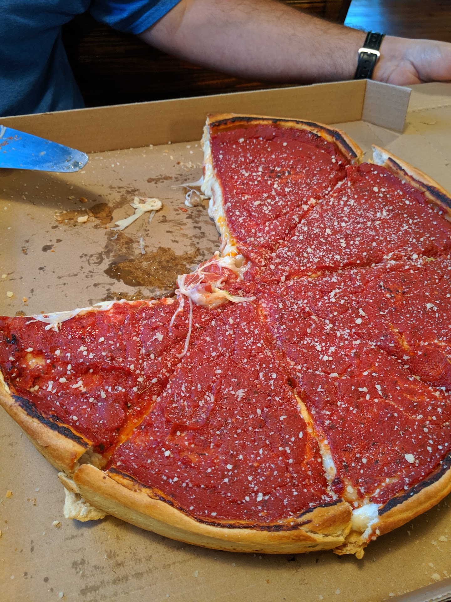 Read moreIf you are looking for actual deep dish Chicago pizza, this is NOT the place to go, unless you like paying Chicago prices for inferior pizza. We ordered the Aces special: peppers, onions, sausage, pepperoni, and mushrooms. The waitress told us it would take an hour, which we were ok with because Chicago pizza takes 45 minutes to an hour to cook. At one hour the waitress told us our pizza was out and they would cut it in about 5 minutes. At one hour and 25 minutes the waitress told us they had to put it back in the oven because it was not cooked in the middle. At one hour and 45 minutes the pizza was finally brought to the table. It was not even hot, just warm, but it looked good on the outside....until you moved a piece. The toppings were almost non existent and there were globs of cheese everywhere. I ate through half the piece before even hitting one piece of meat. Real Chicago pizza has about 2/3rds less cheese and 2/3rds more toppings. The owner manager guy kept making rounds with other customers and made eye contact with us several times but never came over to apologize for the obvious screw up. Someone from this restaurant needs to take a trip to Chicago and have a slice of real Chicago pie, because...