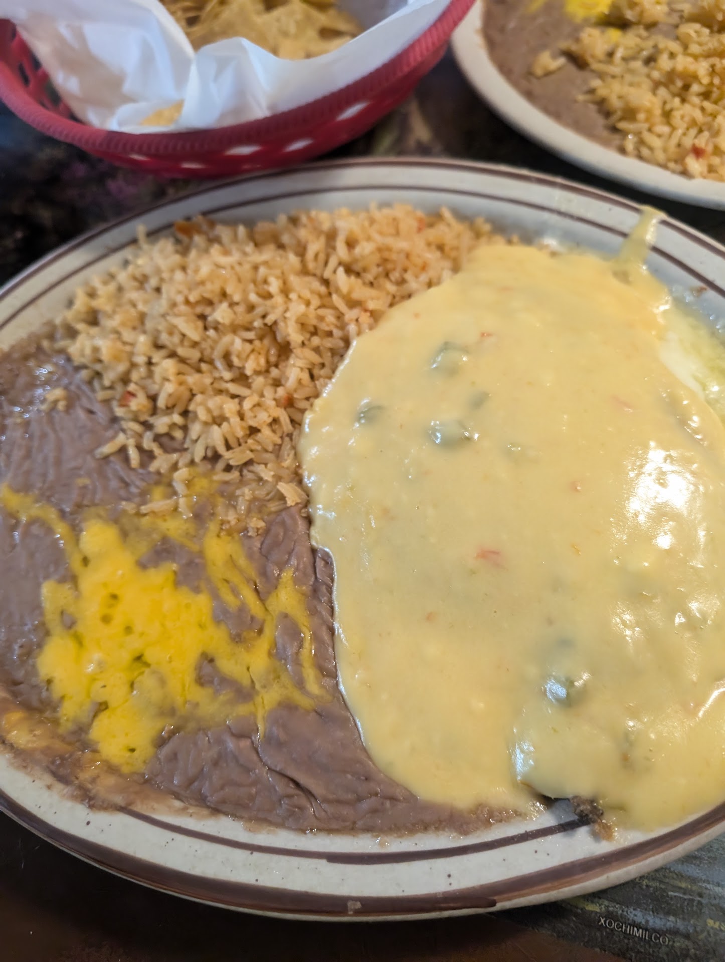 The plates are gigantic. It makes tasting menus look dumb. You may be thinking to yourself, "I'm from the city and a taco is $5." This ain't the place. $10 gets you a honking plate of food. Everything pretty much comes with rice and beans. Everything can and should be covered in cheese. There are bountiful salsa and chips to be had.