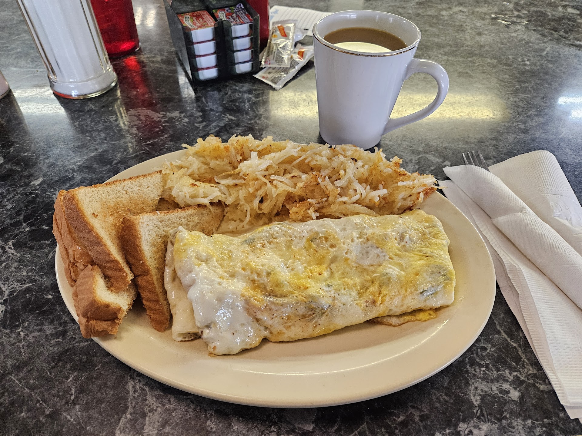 Read moreIt had a nice atmosphere. We were on the road a long time and looking for a family diner for some pancakes, so it was perfect. They didn't have any chocolate chips to put in the kids pancakes, which I thought was a little strange and the short stack was MASSIVE, but the kids really enjoyed the ham steak. I had the BLT sandwich and it was pretty standard, but the cheese fries were a little strange, as it was just slices of American cheese barely melted on, I'm not sure if that's normal here though, but we usually have melted nacho cheese on them where I'm from. one of each of the kids pancakes were pretty burnt. My husband enjoyed his burger, the sweet tea was really good, the staff was super friendly and I would probably go back if I lived closer. Honestly, the biggest issue I had was how narrow the front of the restaurant is. It was difficult navigating in a place you're unfamiliar with, trying to get two small children inside and also getting over to the...