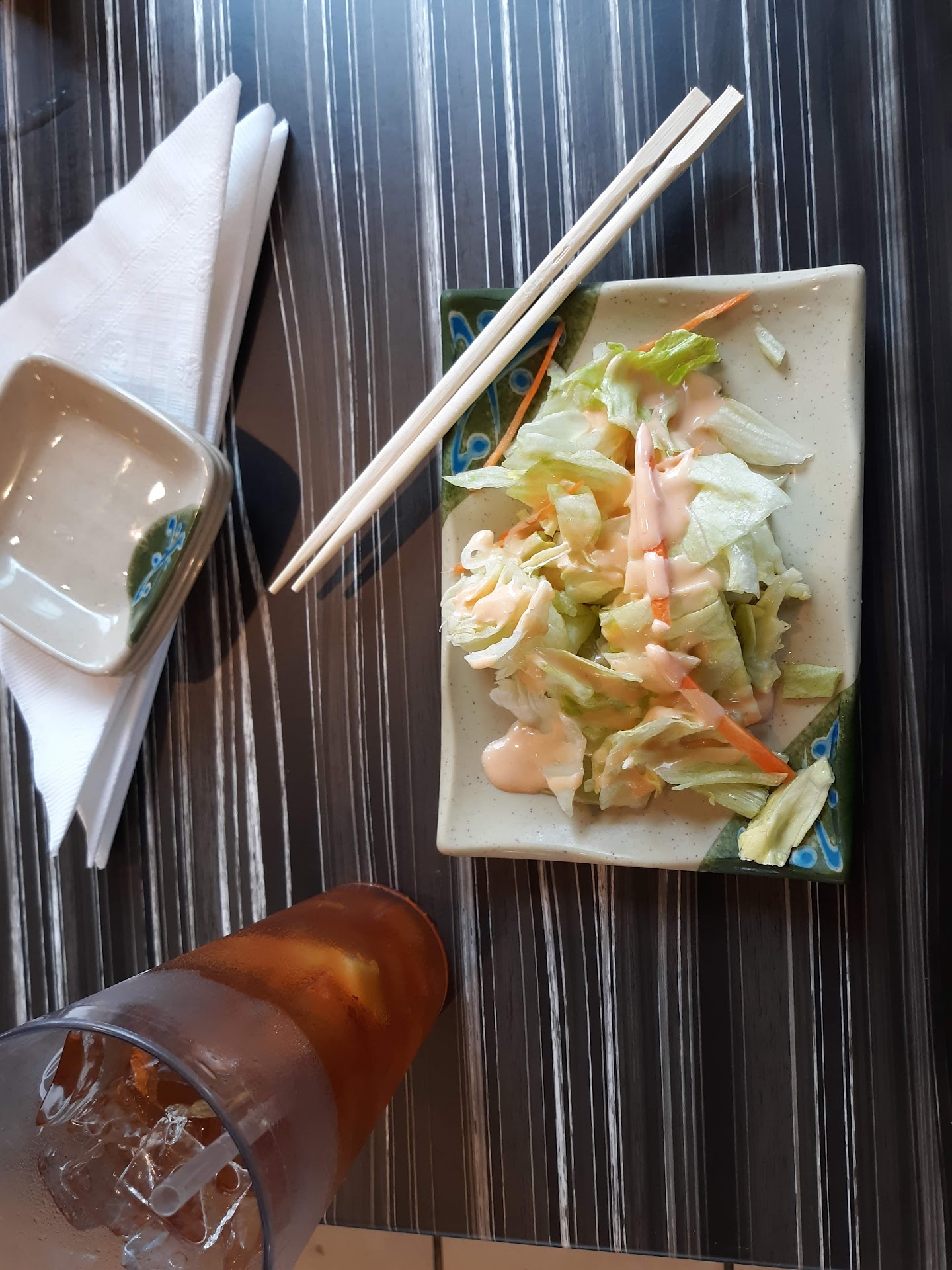 When food is delivered, the waitress needs to double check the food delivered that it matches the order, then look the table over seeing if anything is needed. We had missing salads, soup and one entree. Also I had to get napkins and soy sauce cups myself for the table. The person bringing the food left so fast, (place was full and very very busy) we weren't given the opportunity to ask for anything. ie silverware.