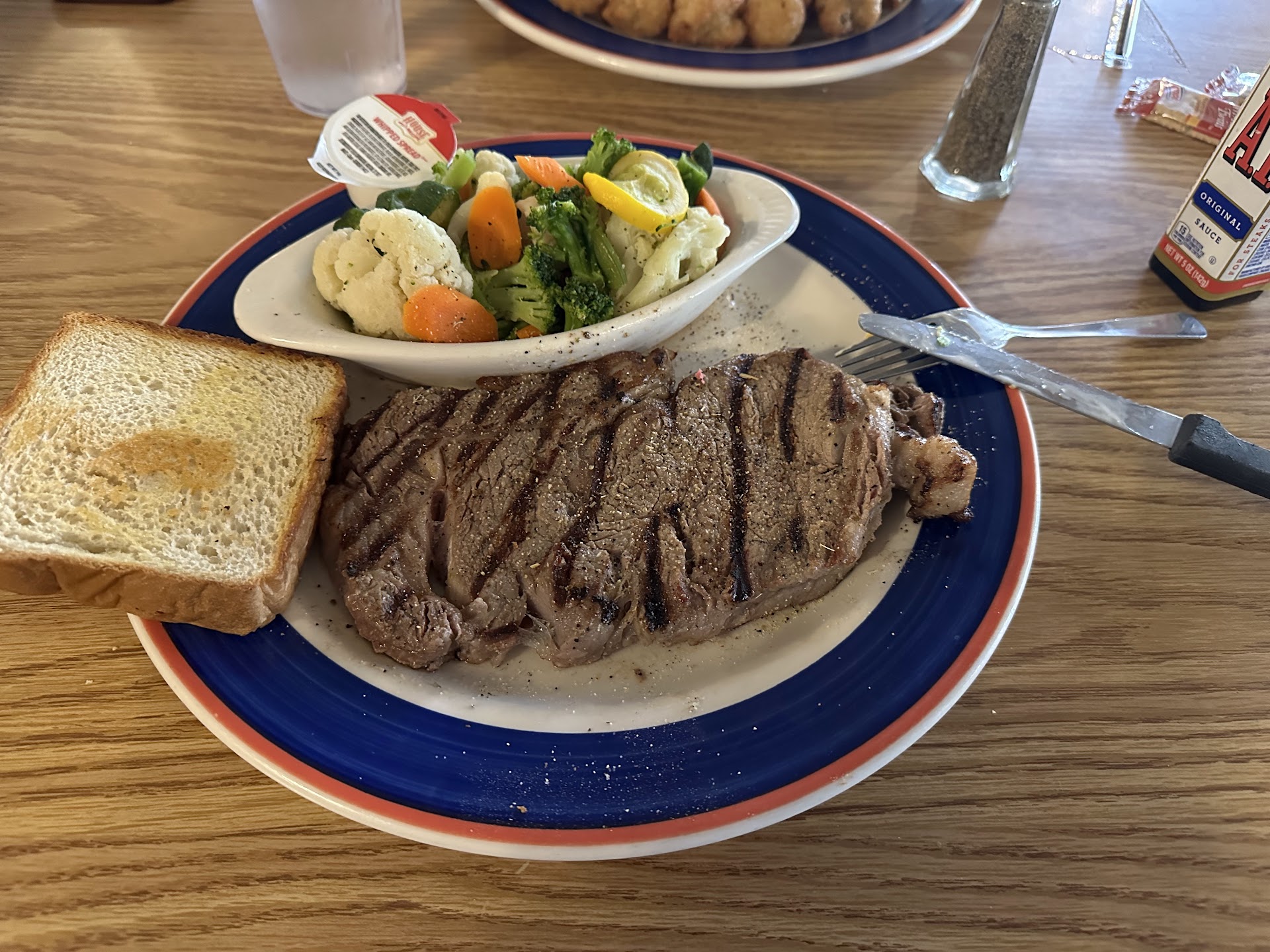 The next challenge to the staff and to customers was ordering entrees. Steak and catfish plates were ordered all around. All of the main entrees come with the bottomless salad bar, so everyone adjourned to get salads. For the little one, the crackers on the salad bar were a great 'appetizer' to satisfy.