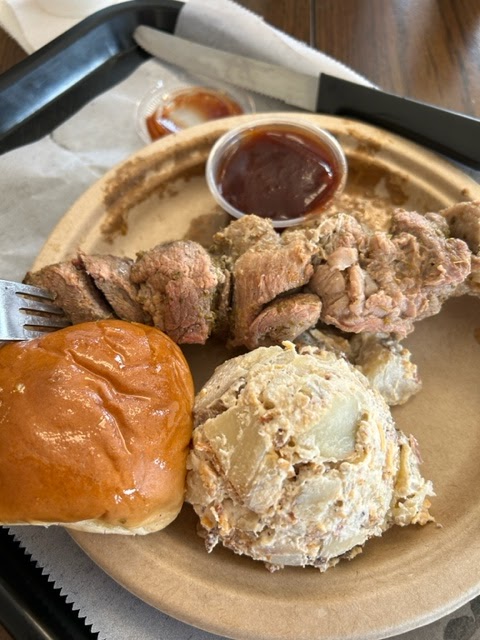 I had heard great things about this place so hubby and I went to try it. Now, we did get there at 1:20 pm, not realizing that they closed at 2:30, so we may have got the tail end of the food, but I expected the pork to have a little flavor. The pork "buttstick" meat was almost steamed and gray looking, not browned and flavorful. I took most of mine home and then cooked it for our next meal in a way that redeemed it. My husband did the same with his pork loin. The potato salad was a little cloying, with lots of shredded cheese in it, so I heated that up at home, improving it's flavor too. The people were nice enough, but no table service except to deliver our food. The decor is interesting, but not set up in a great way. Maybe I expected too much, but I was a little...