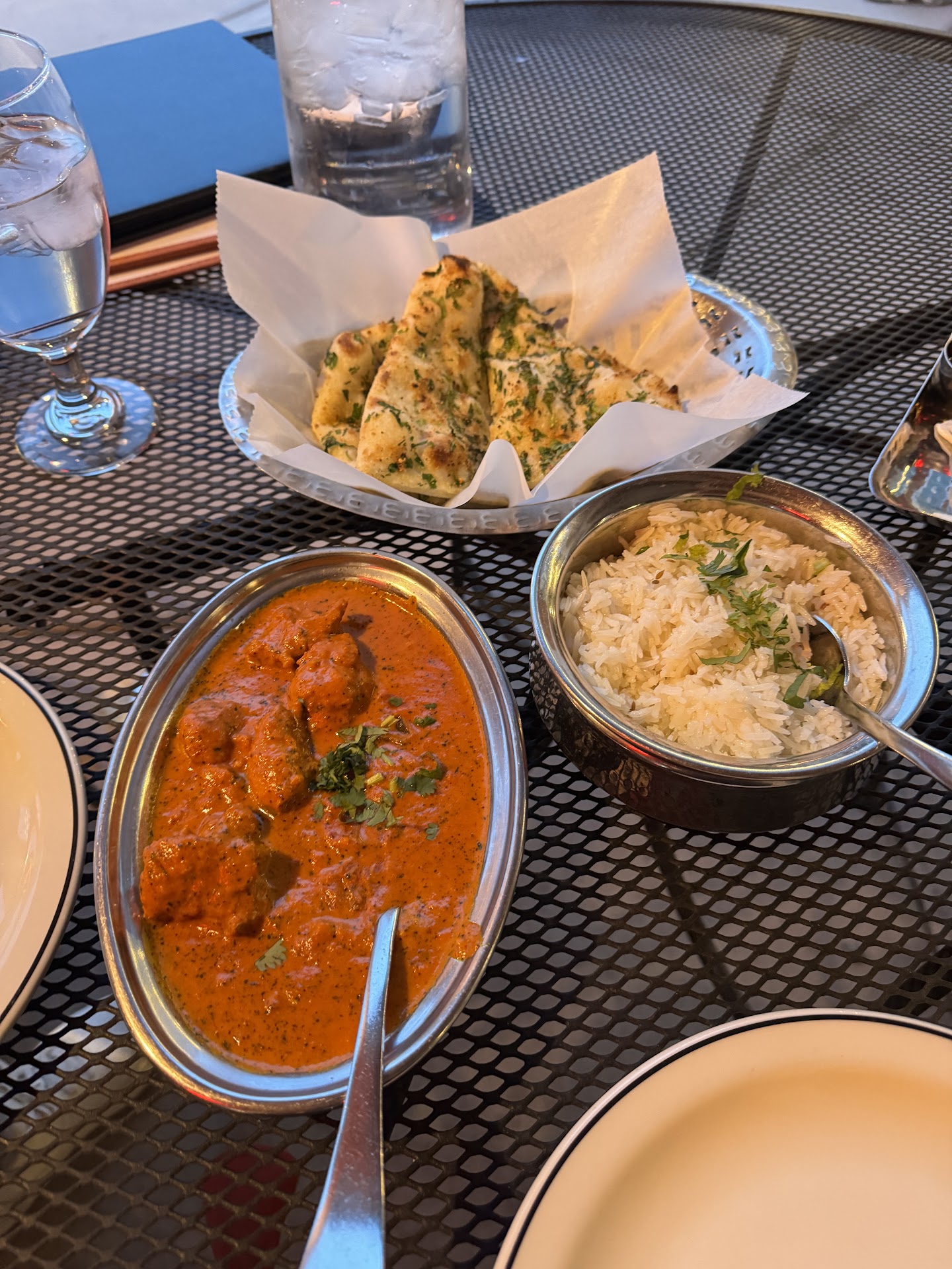 For our main course, we shared a medium-spice chicken tikka masala. The sauce was rich, and the chicken was juicy and tender. It paired wonderfully with the other star of the show: the Naan bread, especially the onion naan. What a game changer! We love garlic naan—which we ordered—but the onion naan was truly special.