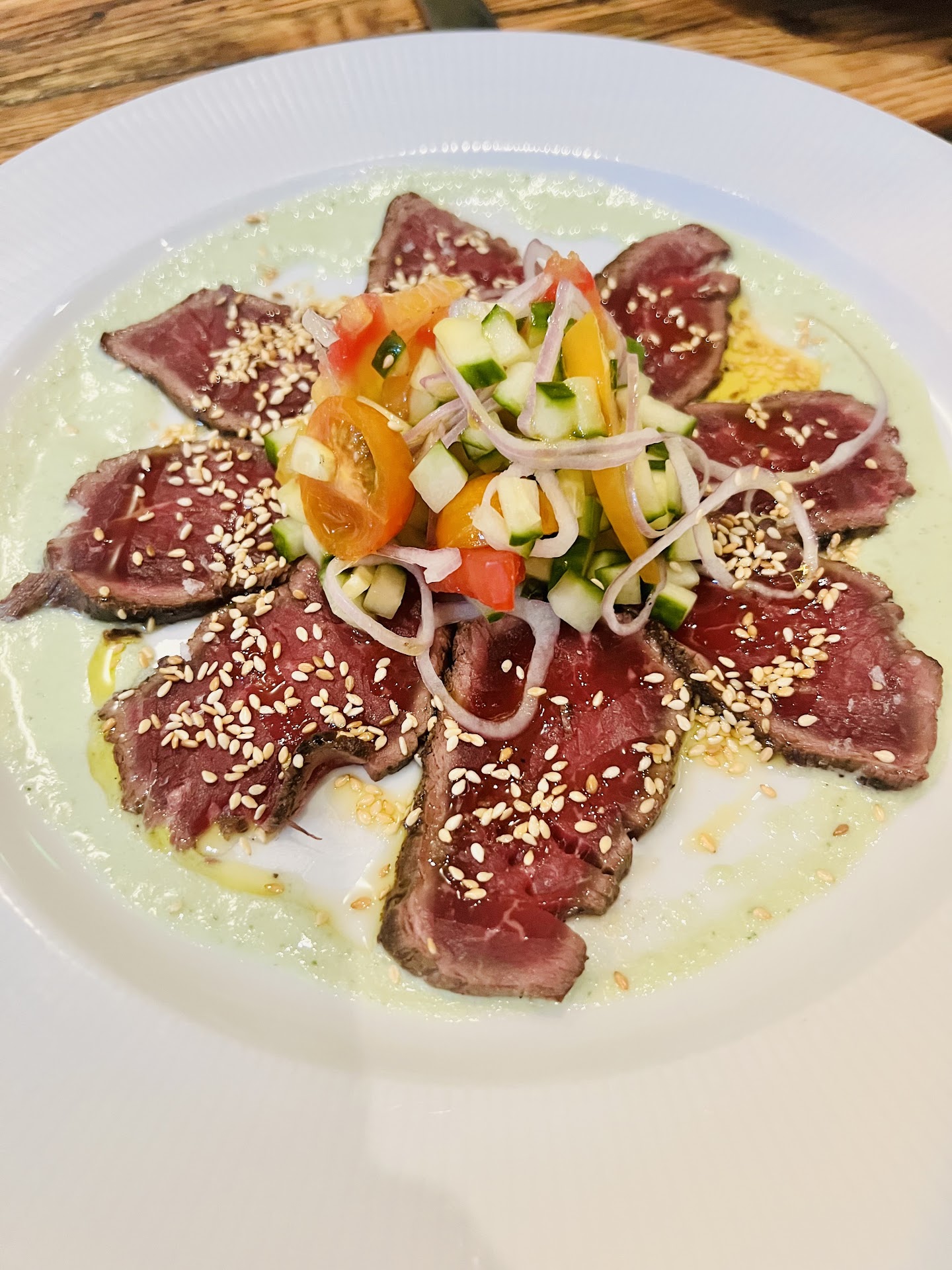 Read moreI am a fan of Bill White's restaurants but felt that this one did not quite measure up in terms of overall value. The place has a good location with a nice balcony overlooking Main Street for the rare days when it's warm enough to sit outside. We had the Tofu appetizer which was excellent and had a surprisingly pleasing texture. The tomato panzanella was nothing to write home about. My wife had the seabass as her entree which was outstanding; the best thing we ate that night. I ordered the flank steak which was overdone and not particularly flavorful, although the cucumber salad it was resting on was nicely balanced with a good combination of flavors. The Baked Alaska for dessert was quite good.