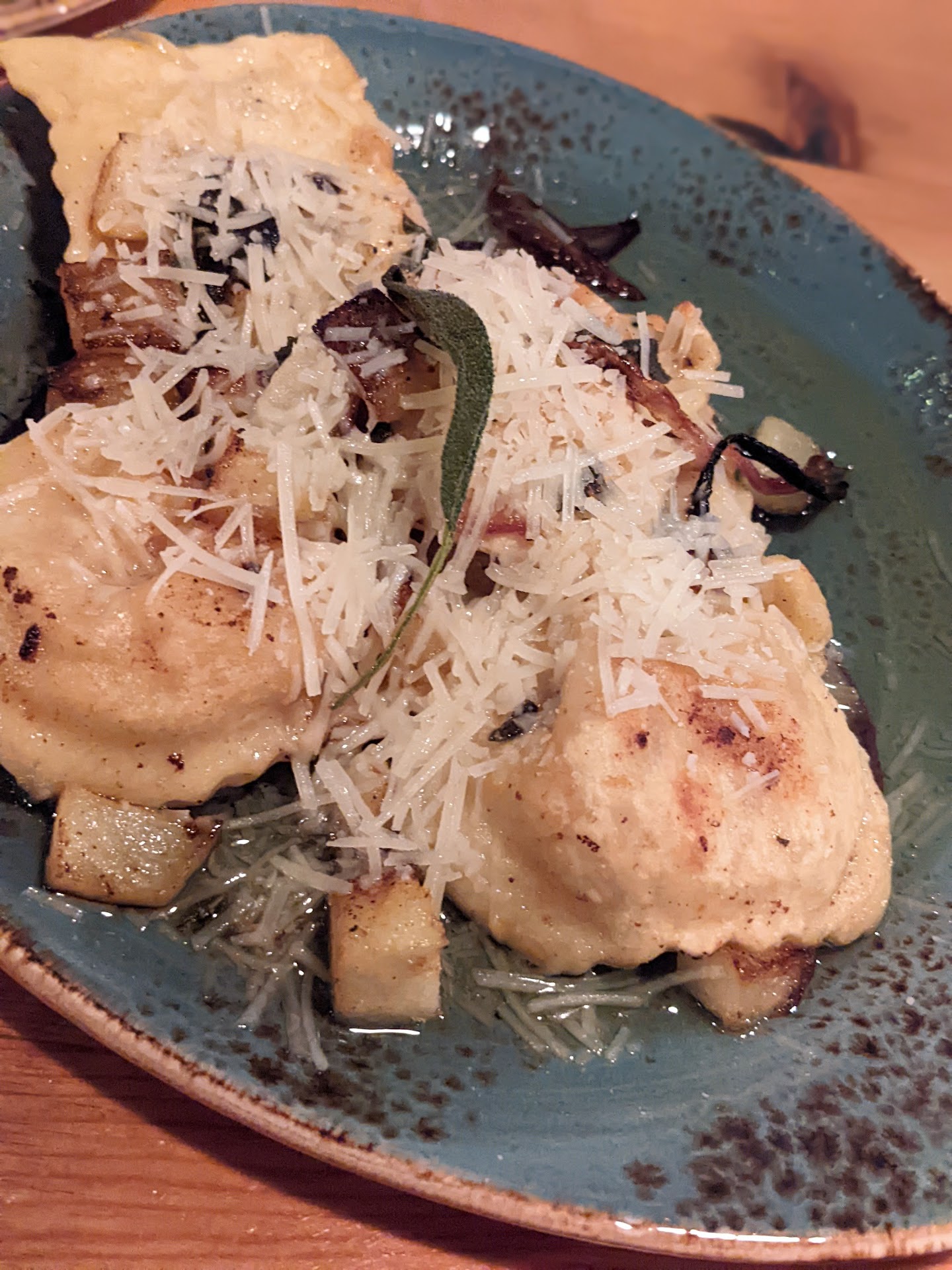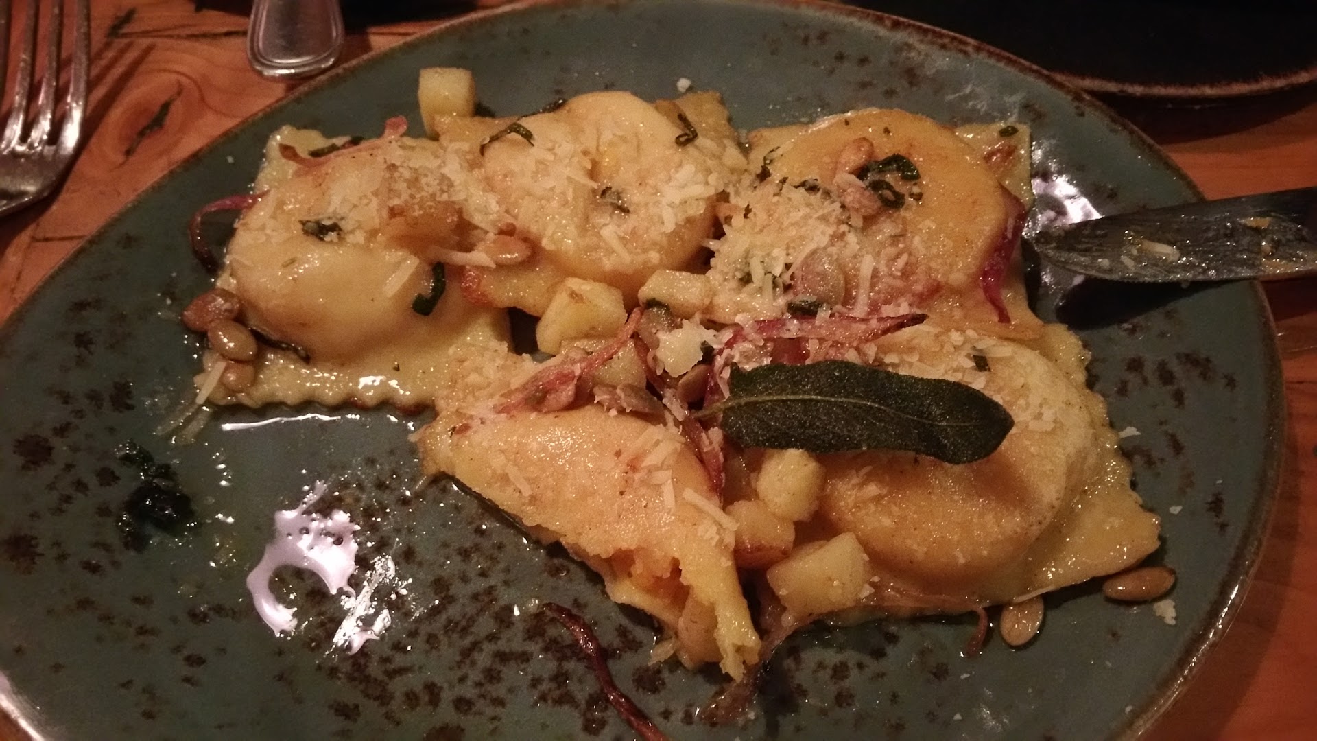 My initial thoughts were that the ambience is very upscale and it seemed like a very nice restaurant and I was excited to try the food. We ordered three drinks off of the drink menu and for lack of a better term, they all tasted like various forms of cough syrup. Two appetizers were ordered one was the beet salad the other was the "pork belly brussel sprouts". The braised beet salad should just be called a salad with a few beets sprinkled on top. The brussel sprouts had overcooked pieces of bacon and not a visible piece of pork belly in sight. I'm including a picture of the butternut squash ravioli for everyone to see. This mind you was $26. The flavor tasted like old vinegar, it was not sweet, it had no semblance of comfort food as you would expect.