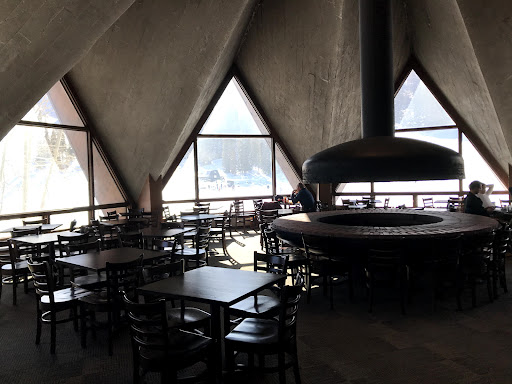 Really cool lodge to hang out in, warm up, have a beer and or some food. The Upstairs is huge. I ate in all the lodges on this slope and this is the largest one. Tons of seating upstairs with a great almost panoramic view of the slopes and surrounding forest.
