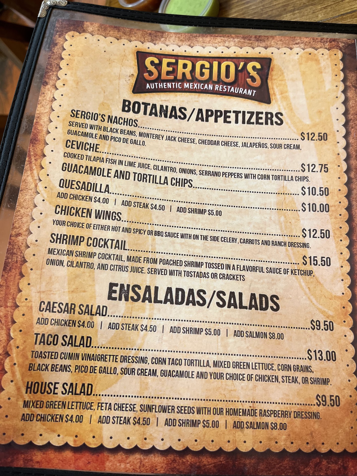 Read moreThe food at Sergios was pretty good. We had a variety of items in our group of 10, tacos, carnitas, sopes, and more. All of it was pretty good, though the carne asada was overcooked and dry. The biggest problem we had was service. It seemed like there was not enough wait staff for the number of tables, and there aren't many tables. We had to wait quite a while to get our drinks, and then to order. Once we ordered another table of 6 sat down nearby. We then watched as half our group got their food, and then the table of 6 order and got their food. By this point it had been 45 minutes from when we ordered and 4 of us had no food. Apparently they had completely misplaced our order. They finally brought it out and got my wife's order wrong, bringing out something completely different. Needless to say, she wasn't happy, but at this point it was so late she just ate it.