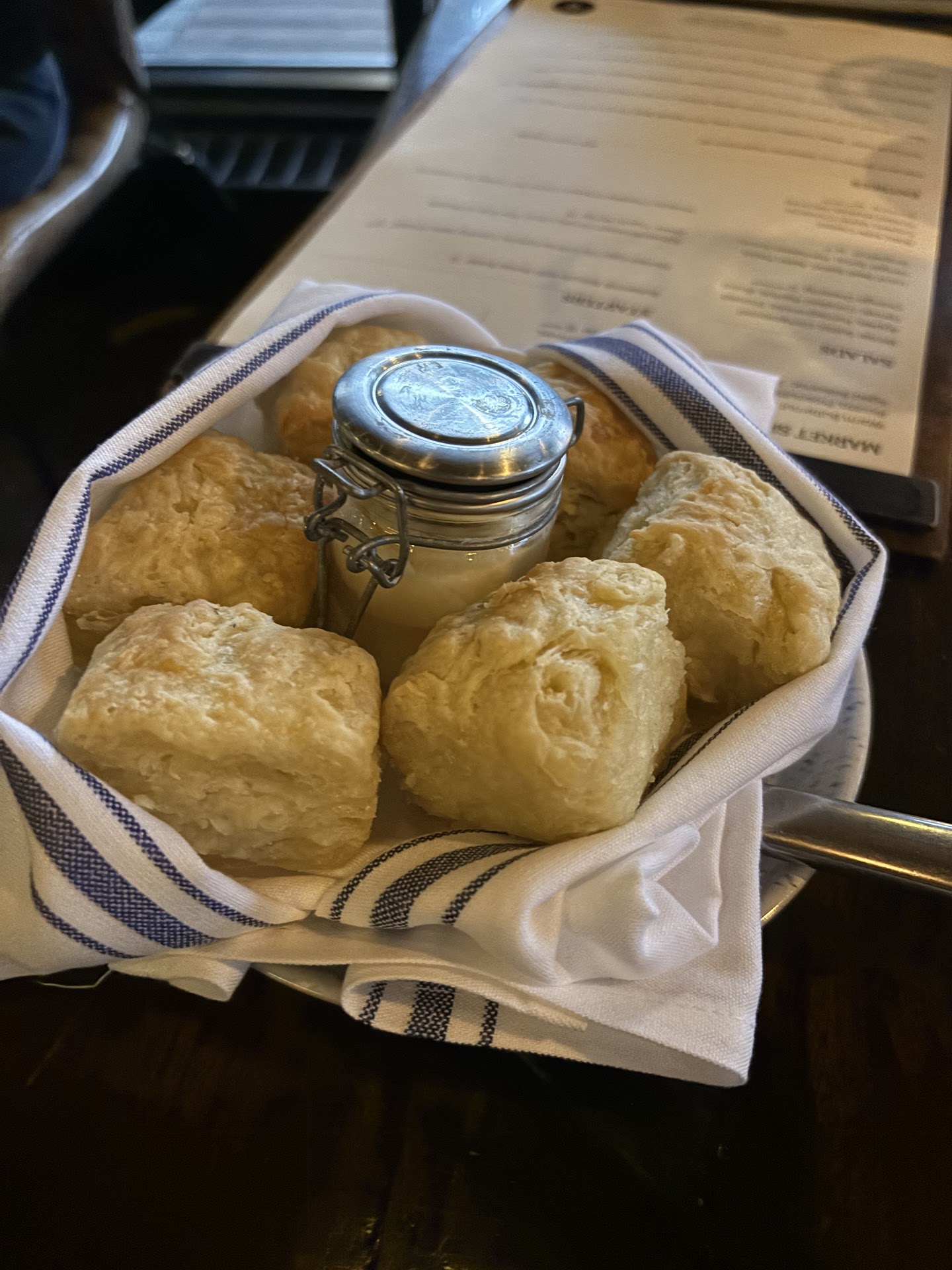 My friends ordered: Buttermilk Biscuits with honey butter - teeny tiny, bite-sized biscuits with butter that seemed to stick to the roof of your mouth Idaho Trout - the bass was accidentally served to them, but eventually they sent out the correct dish and they loved it! Roasted Fall Vegetables - they were al dente, not hot, and didn't taste roasted