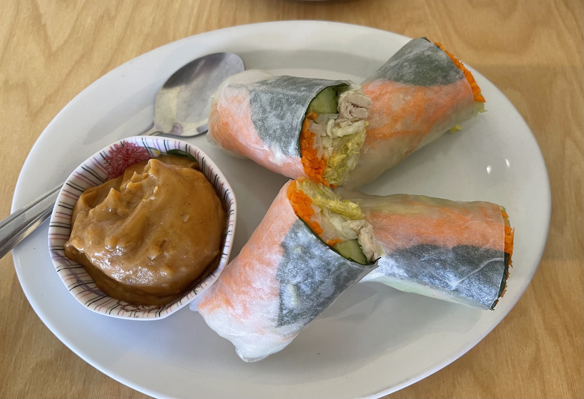 Read moreFirst time here. I'm by means no expert on Thai food, but I am a (self-proclaimed) expert on why I came here in the first place. Tom Yum Soup. I ordered a large chicken soup with a 5 on a 1-5 "spicy scale" because I LIKE PAIIIN. Turns out, it was just "pretty spicy". Nothing that would blow your socks off, but everyone's different. The broth was amazing. The one complaint is that I wish they wouldn't use white button mushrooms and instead use oyster mushrooms as those are more traditional and it doesn't throw off the texture of the soup like buttons do. I also got a side of spring rolls that were awesome. The staff are SUPER efficient, as you have all these ANNOYING online orderers clogging the queue coming into the restaurant, early mind you, and then throwing a fit that their order isn't ready. The 2 ladies working the front were polite, professional and QUICK. My appetizer of FRESH spring rolls came out within 2 minutes of ordering. And this place was busy as heck. The only things that were meh is that the restaurant itself is very small and cramped (not much you can do about that) and the chairs sitting down are quite uncomfortable. Overall a very...