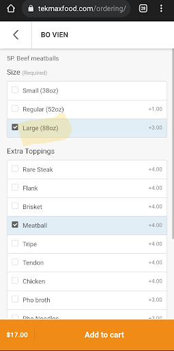I ordered two large Pho from their online ordering, which states “88 oz.”. The ordering platform includes other sizes as small - 38 oz. and medium - 52 oz.. I figured two 88 oz. would be enough for four people to each have about 40 oz. of broth. What they sent home when my wife picked it up on her way home was two 32 oz. containers of broth (64 oz. in total), the noodles and meatballs (both were cold, so we had to heat them up), the sprouts and basil and two very small sauces.