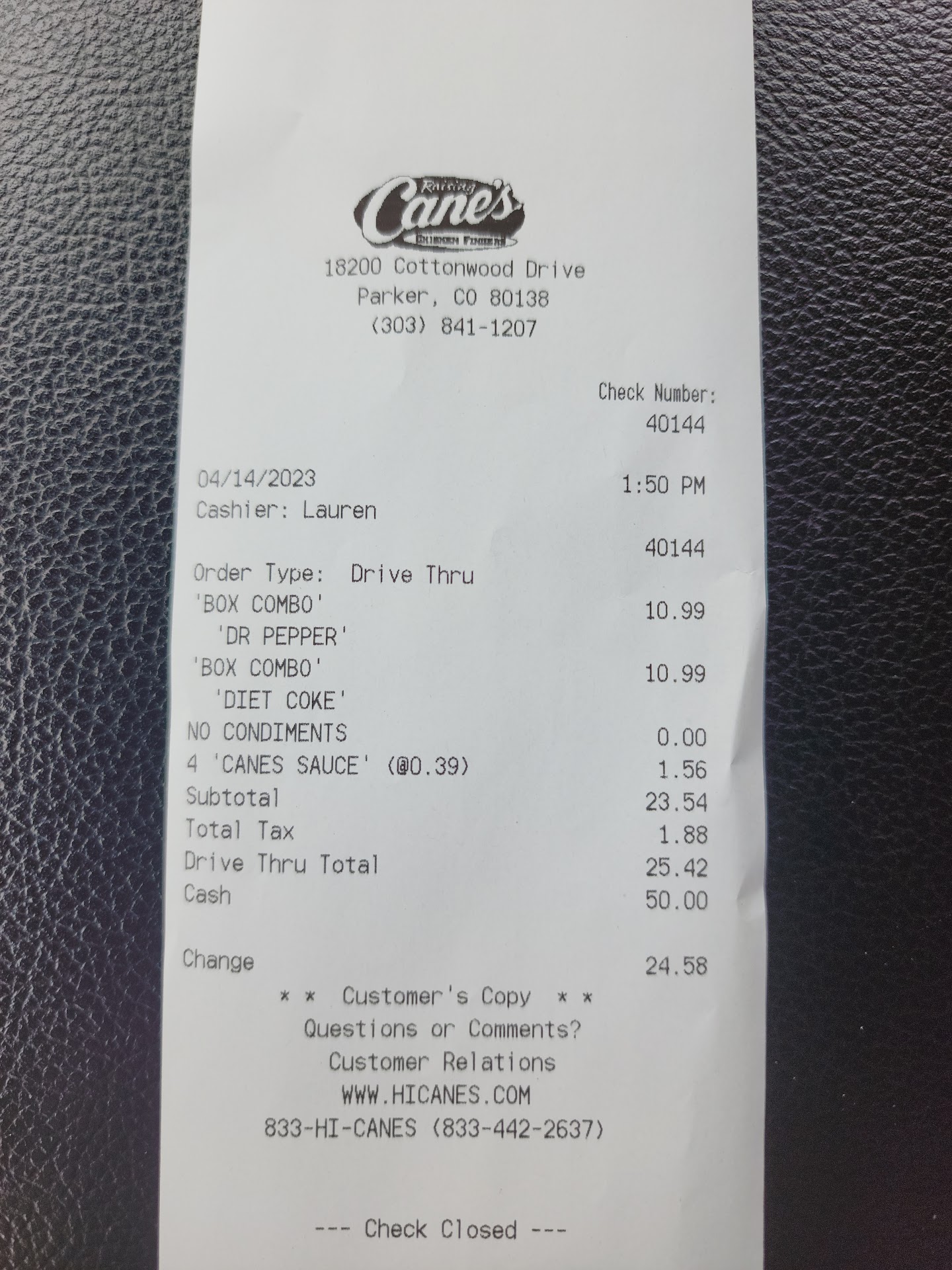Read moreThis is mainly about service at the drive-through! Raising Cains, your drawer for the afternoon should be over at least 50 cents, but it's probably more since your drive-through window employee doesn't know how to count (unless its intentional and he pockets the money)! After a long flight back to town and not having eaten yet for the day, I decided to go to Raising Cains. I was hungry and wanted something that would not disappoint. After being greeted by a nice person through the menu, I ordered and eventually made it to the window. My total was $25.42, I had a $50 bill that I handed the young man, then said, "I also have two quarters." I saw a confused look on the boy's face and should have pulled the coins back, but I figured he has a register if he puts the amount of $50.50 into the register he should see a return amount of $25.08 to return to me. Simple math. Return two bills (a $20 and a $5) and 4 coins (a nickel and three pennies). Does this happen, nope. Maybe it was the fascination with the Grant (Ulysses S. Grant is on our $50 bill), or using the counterfeit pen, laziness, or maybe being uneducated. He puts $50 in the register and then returns $24.58. And of course, he doesn't return the cash properly (just hands me a receipt and dumps all the money in my hand). Terrible! This location will lose money or be over due to this guy working the register. Absolutely ridiculous!!!!!! Don't pay with cash here, folks! I'm thinking of what Joe Pesci said in Leathal Weapon 2 about the...