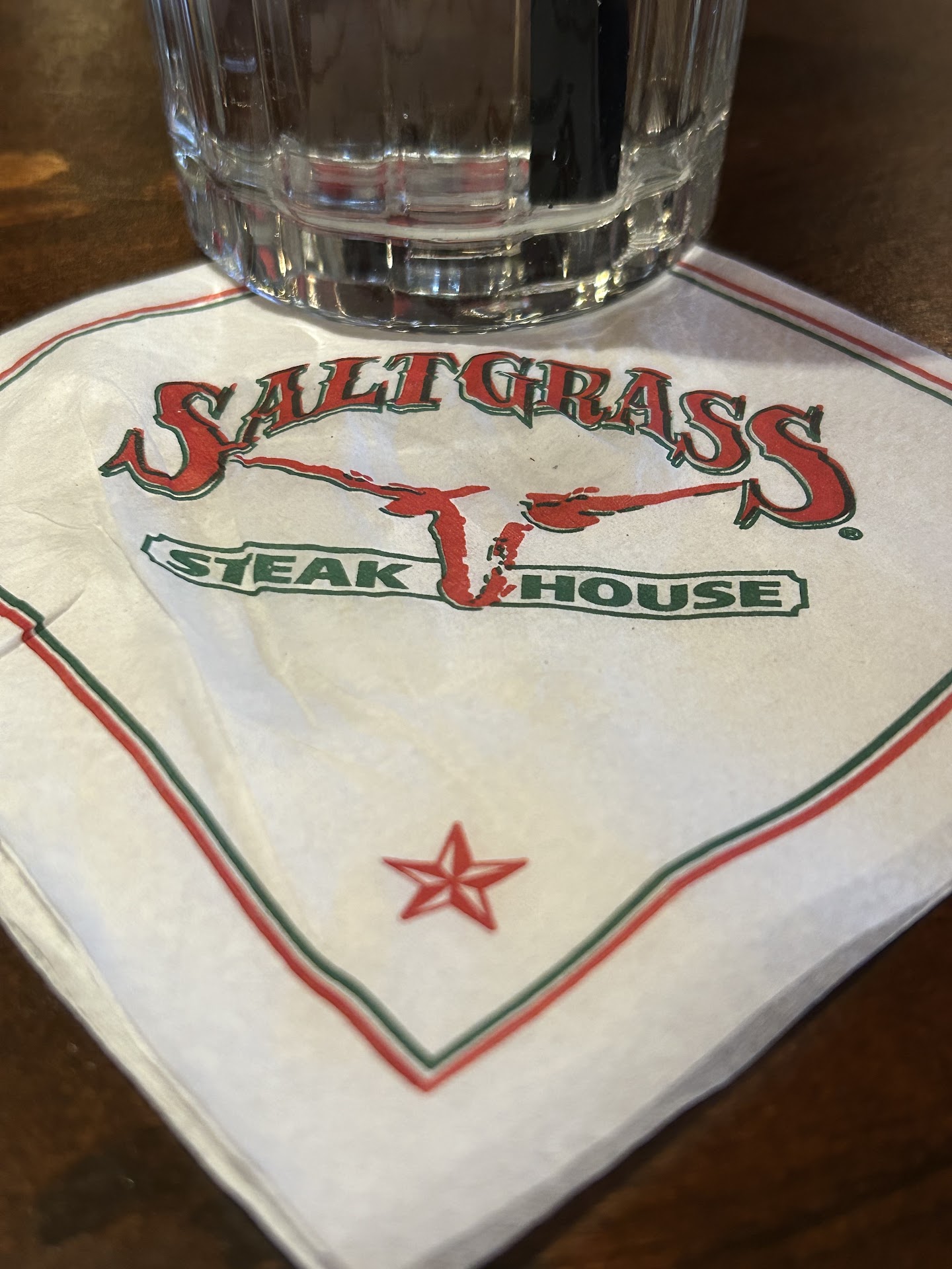 Read moreWe had gift cards to Morton's, which sadly, is long gone. Saltgrass is part of the same chain, so we got to try them for the first time. The decor is "corporate country", which is to say there are deer heads on the wall, old drugtore signs, and lots of knotty wood. Pleasant enough. We were seated right between two other tables, even though the place was mostly empty.