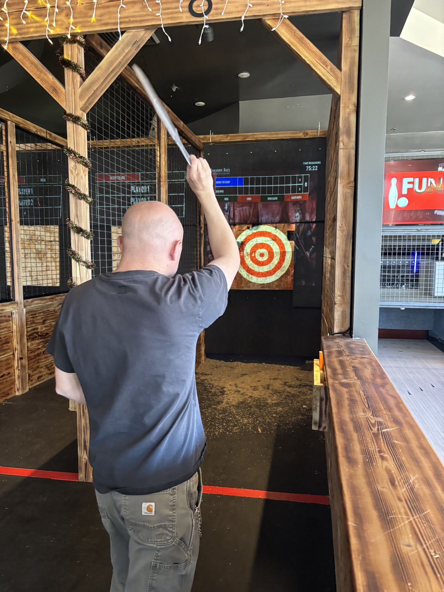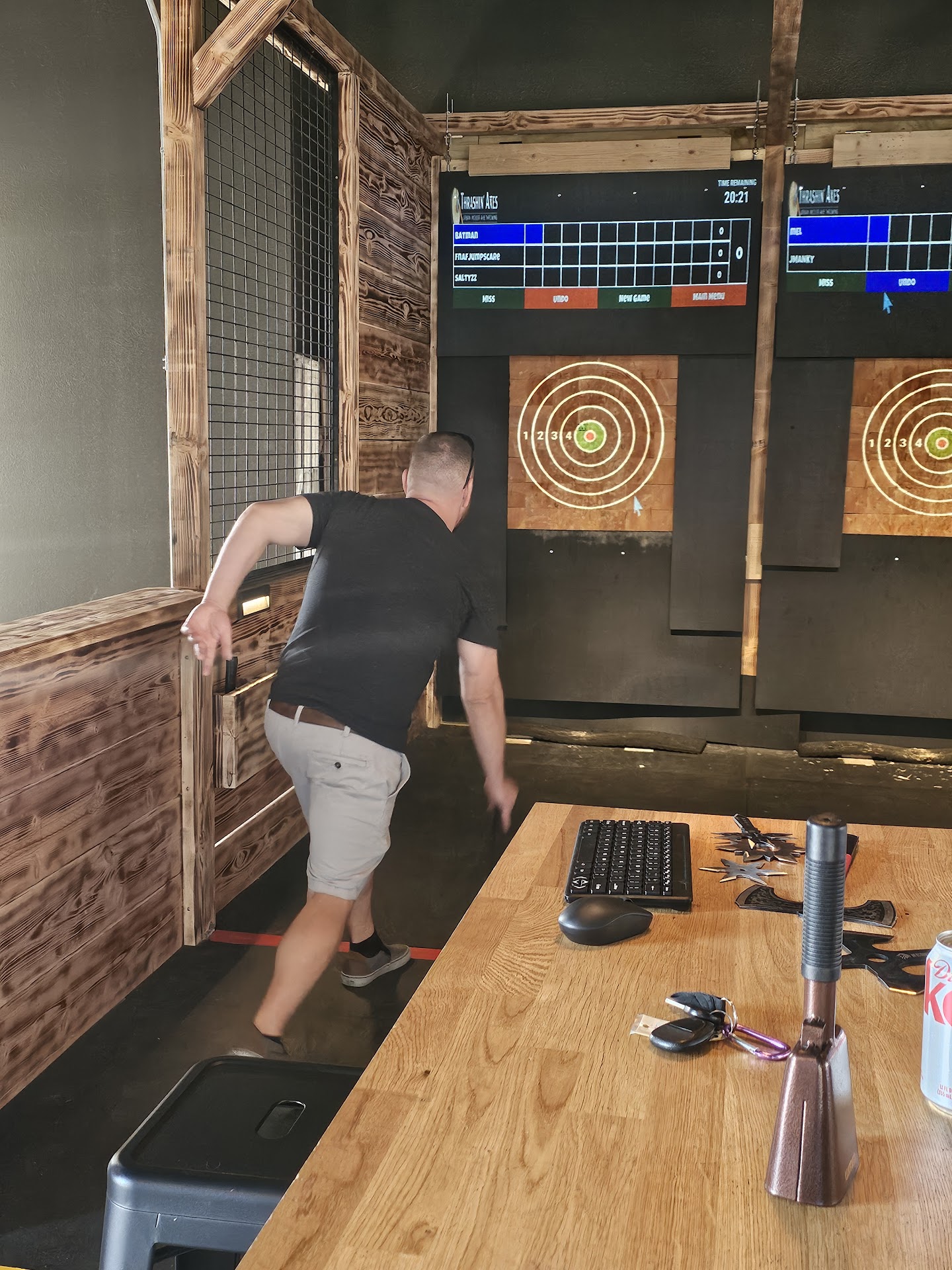 They also have duck pin bowling which we didn't try, I might give it a go next time. And we noticed that theres a mini break room. Not like to stop work and get coffee.. like a BREAK room. As in, putting on protective coveralls and goggles so you can go break stuff. I was tempted to ask about it but, it was a bit warm in there already. I didnt fancy wearing a full white hazmat looking suit when I was already hot. I mean.. its fall in Colorado so its not uncommon for doors and windows to be open in the evening at establishments. Id admit that cooler air would have been appreciated. Definitely wear comfortable clothes that you don't mind getting a tad sweaty in if youre throwing axes. Its a physical game afterall.
