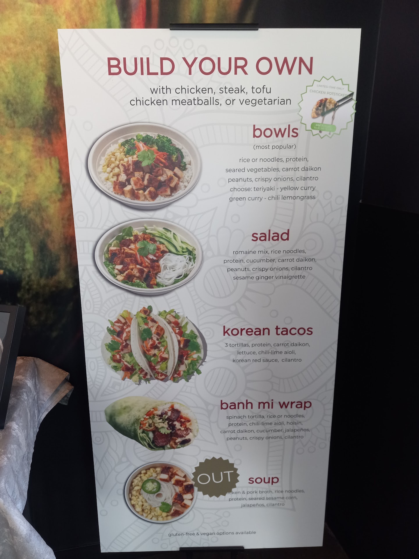 Read more9/29/24-This place is horrible for so many different reasons. First off while we were eating one of the employees was spraying window cleaner on the glass over the food with the particles going backwards towards the food. This is totally unsafe for the food and exposes people to ingesting chemicals. The worker at the register was rude. They do not clearly everywhere mark that there is an up charge for the yakisoba noodles. They only have it marked in one place under "extras" making you think that the upcharge is for if you order extra noodles. This is a highly misleading sales tactic. The employees also don't tell you about the extra charge when you tell them you want it like other businesses do as part of their basic customer service. So once again misleading. The food quality was below average as a whole. They bowls were about average. The chips and guacamole was a rip off. They just give you a little sauce cup of guacamole for te nearly $5. It was super bland. Even though I saw small onions in it they didnothing to help the flavor and there was no tomatoes in it. So it was super small for bad quality. The fresca were also vastly watered down. Colorado has so many places to get frecas at that when a store waters them down it is super obvious. Then the parking is rough. This business shares a small lot with other businesses including a Trader Joe's. This means that the lot is packed and you will drive around for a long time. There is also a lack of handicap spots with the closest ones being in front of the Trader Joe's a few shops over. Just an all around bad experience, with possible health risks, so I would recommend...