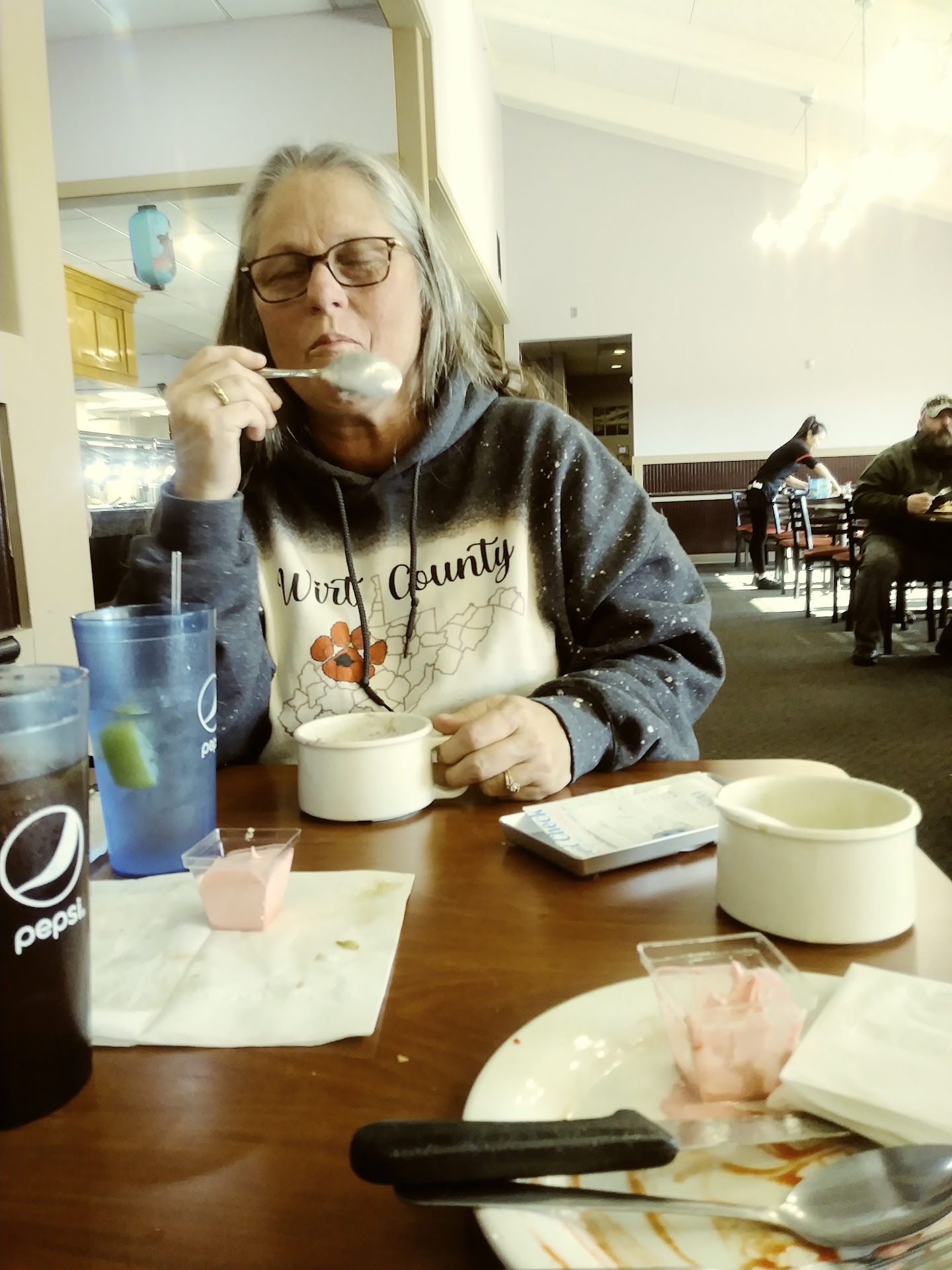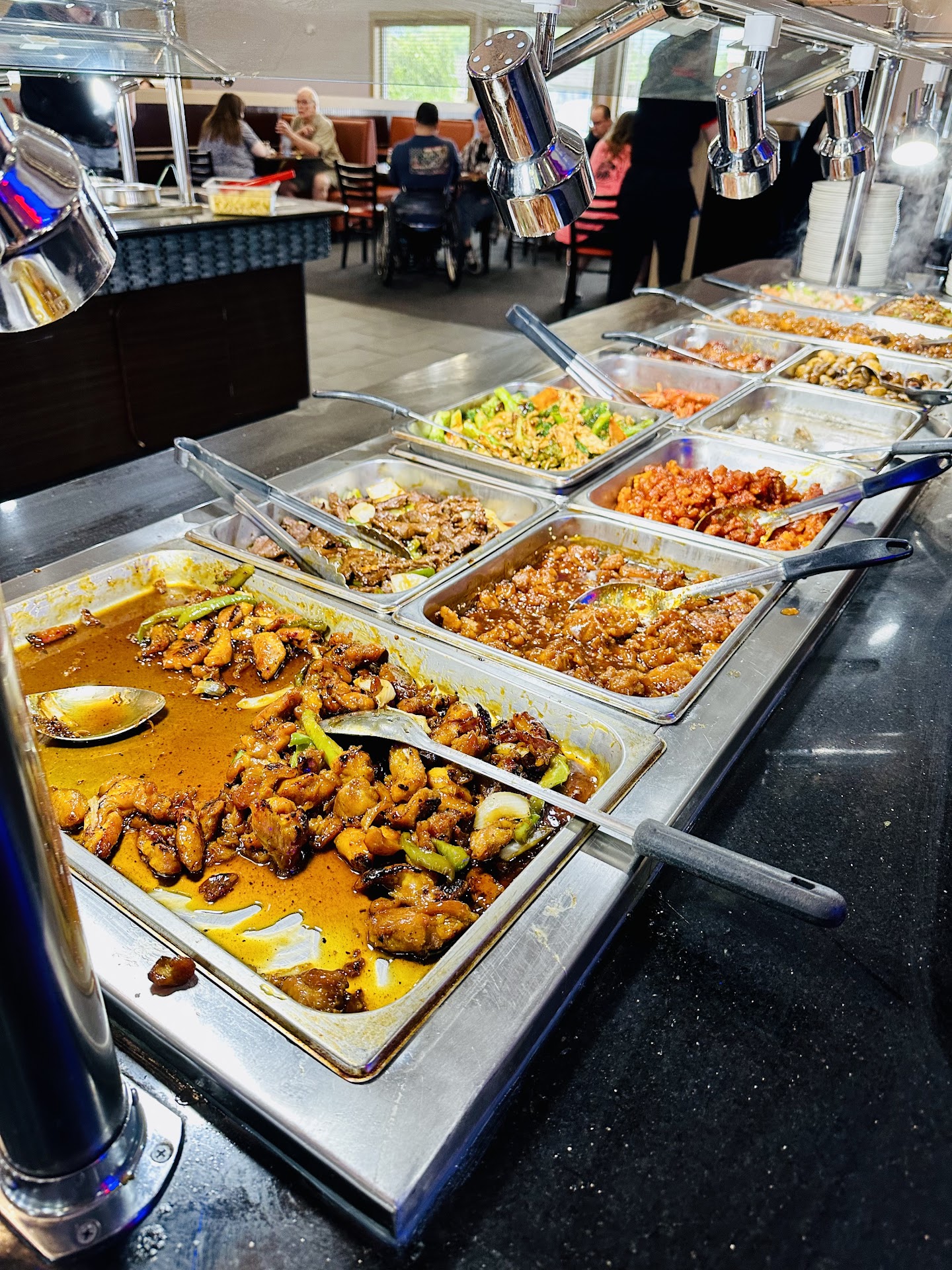 My kids ate a plate and ice cream each. My husband and I each got 2 plates. My first plate wasn't even finished because I couldn't force myself to eat it. The second plate was only mashed potatoes and egg rolls. Our drinks came with maybe 9 pieces of ice floating at the top of each cup of tea and they weren't refilled at all.