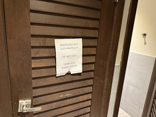 The bathrooms were a disaster. One toilet was clogged, and the other was marked "Do Not Use" because the lock was broken. Towels were strewn across the floor, and the state of the restrooms was appalling. If they can’t maintain basic cleanliness, it raises concerns about the kitchen’s hygiene. I took photos because it was that bad.