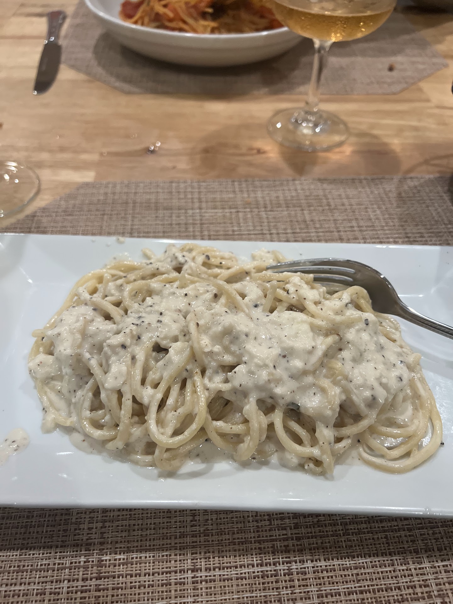 I ordered the cacio e pepe made in the cheese wheel with pecorino cheese. I would have preferred a bit hotter and more gooey as I noticed they left it in the wheel a bit too long. I also prefer the pasta less al dente. But once they shaved black truffles directly onto my dish, my problems were gone just like that. It was still very enjoyable.