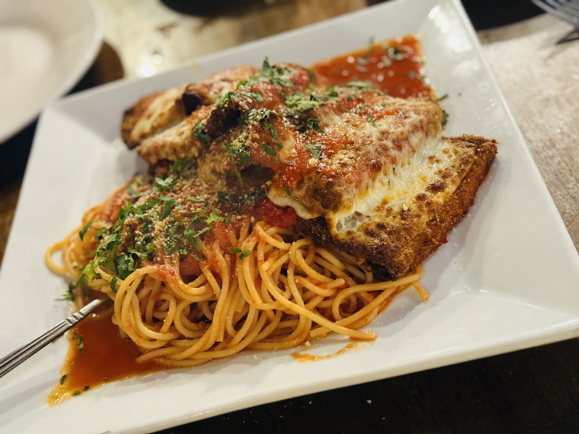 The parm. The regular size is about twice the size as the small, but only $3 more. A massive portion that will serve at least 3 or 4 people. It's heavily breaded but not well-seasoned, and I thought it was very light on cheese, which is a low-moisture mozzarella you would put on pizza. I'm unsure what brand it is, but it didn't taste like a Grande. The sauce itself was somehow very cloyingly sweet (like pizza sauce at their sister restaurant in Coral Springs) and very salty. The pasta was cooked properly , that's about all I can say in praise about it. Rachel and I each had a bite and were disgusted and left the plate as is and asked for the check.